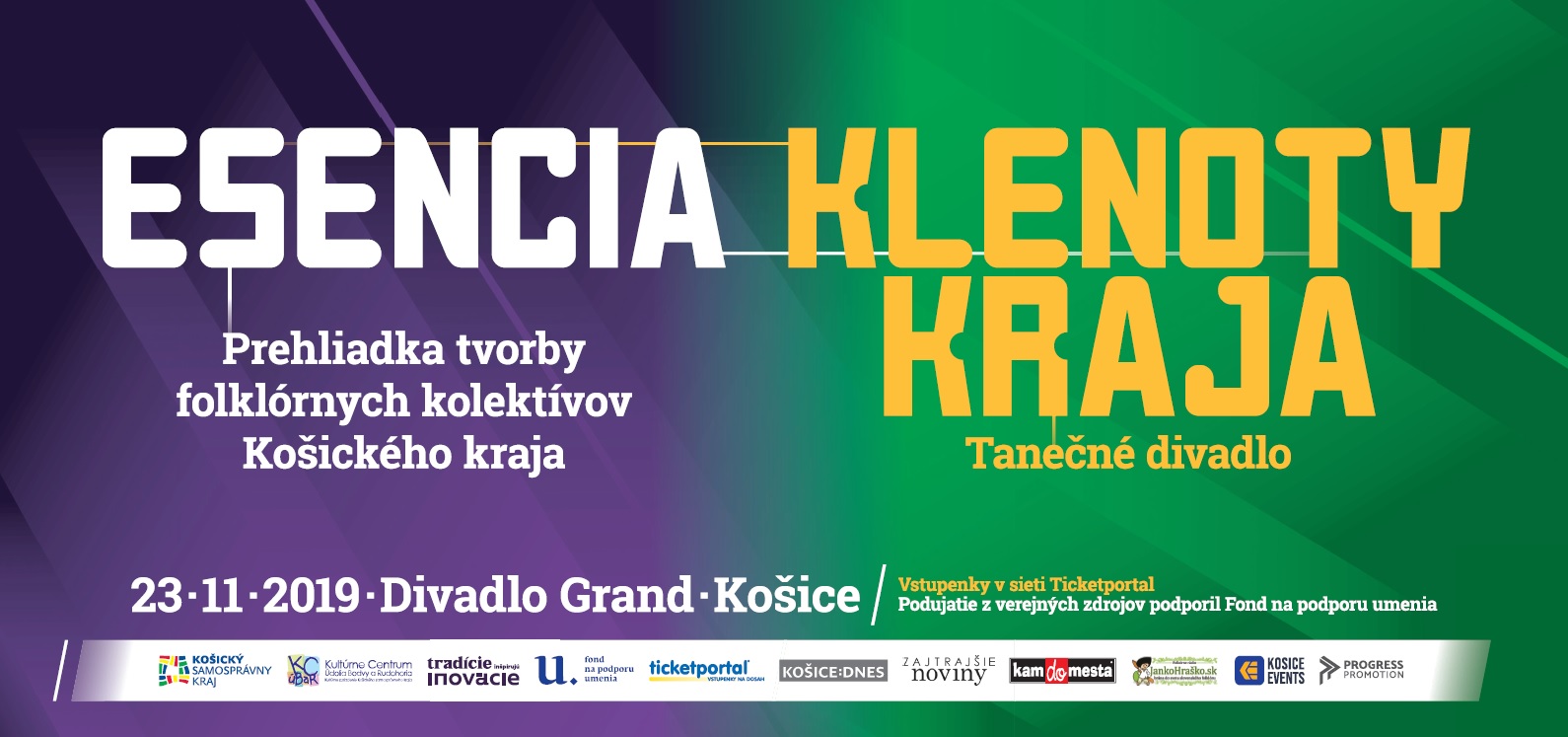 23.11. 2019, 15,00 - 24,00 hod. DIVADLO GRAND, Košice ESENCIA – Antológia folklóru Košického kraja. Prehliadka prezentuje a mapuje súčasnú scénickú tvorbu kolektívov, porovnáva autentickú podobu tanečného folklóru a jeho štylizáciu. Vytvára priestor na odborné hodnotenie a komunikáciu s odborníkmi v danej oblasti, ponúka možnosť získať nové vedomostí a zručnosti. Súčasťou podujatia je odborný seminár na témy z etnológie, Galaprogram a Tanečný dom so školami tanca a tanečnou zábavou.