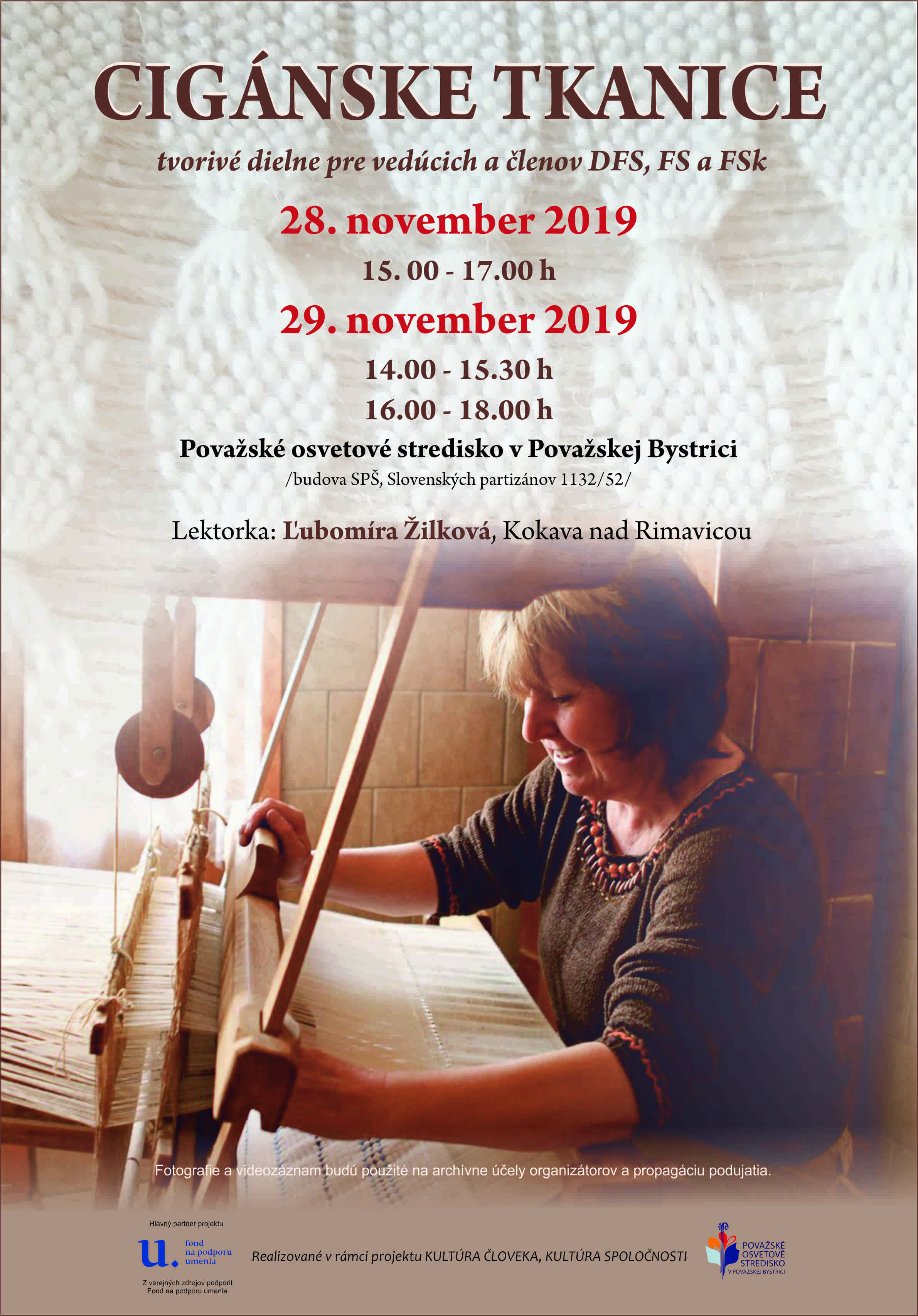 Tvorivé dielne CIGÁNSKE TKANICE s lektorkou Ľubomírou Žilkovou z Kokavy nad Rimavicou. Dielne pre vedúcich a členov DFS, FS a FSk sa uskutočnia 28. - 29. novembra 2019 v Považskom osvetovom stredisku v Považskej Bystrici.