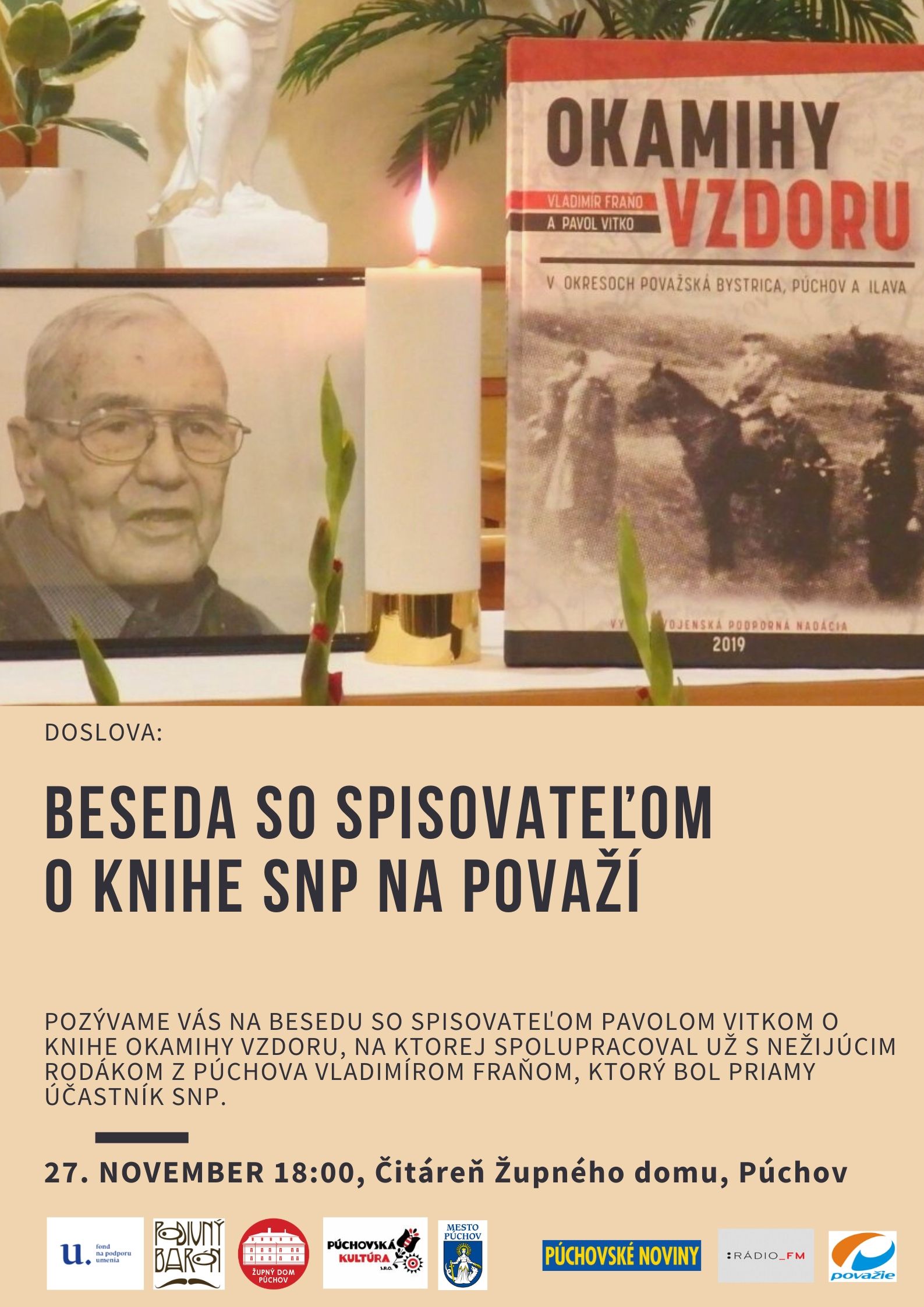 Pozývame vás na besedu so spisovateľom Pavolom Vitkom o knihe Okamihy vzdoru, na ktorej spolupracoval už s nežijúcim rodákom z Púchova Vladimírom Fraňom, ktorý bol priamy účastník SNP.
