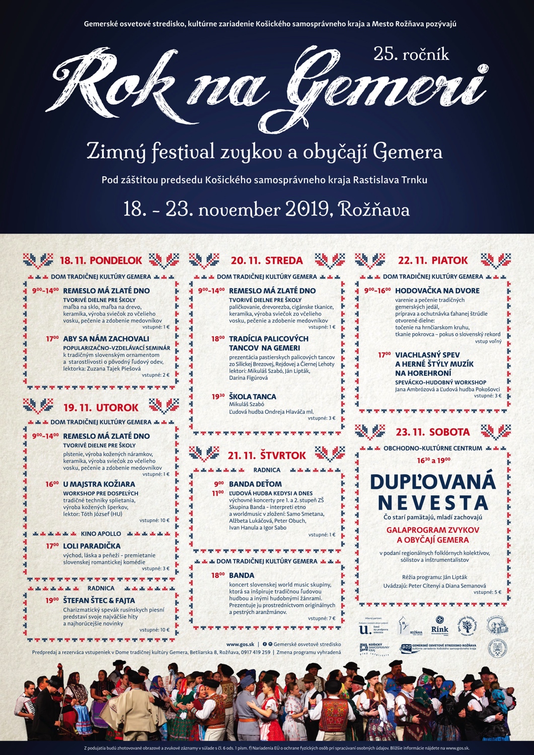 25. ročník zimného festivalu zvykov a obyčají ROK NA GEMERI. Jedinečný týždňový festival aktivít v oblasti tradičnej kultúry - tvorivé dielne, workshopy, tanečné a spevácke domy, koncerty, gastronómia a galaprogram regionálnych folklórnych kolektívov.