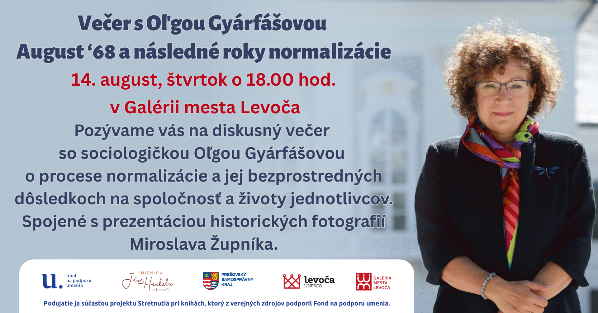 V rámci projektu Stretnutia pri knihách sme pripravili cyklus autorských večerov, počas ktorých nám svoje knihy predstavia súčasní slovenskí autori. V auguste vás pozývame na diskusný večer so sociologičkou Oľgou Gyárfášovou o procese normalizácie a jej bezprostredných dôsledkoch na spoločnosť a životy jednotlivcov.