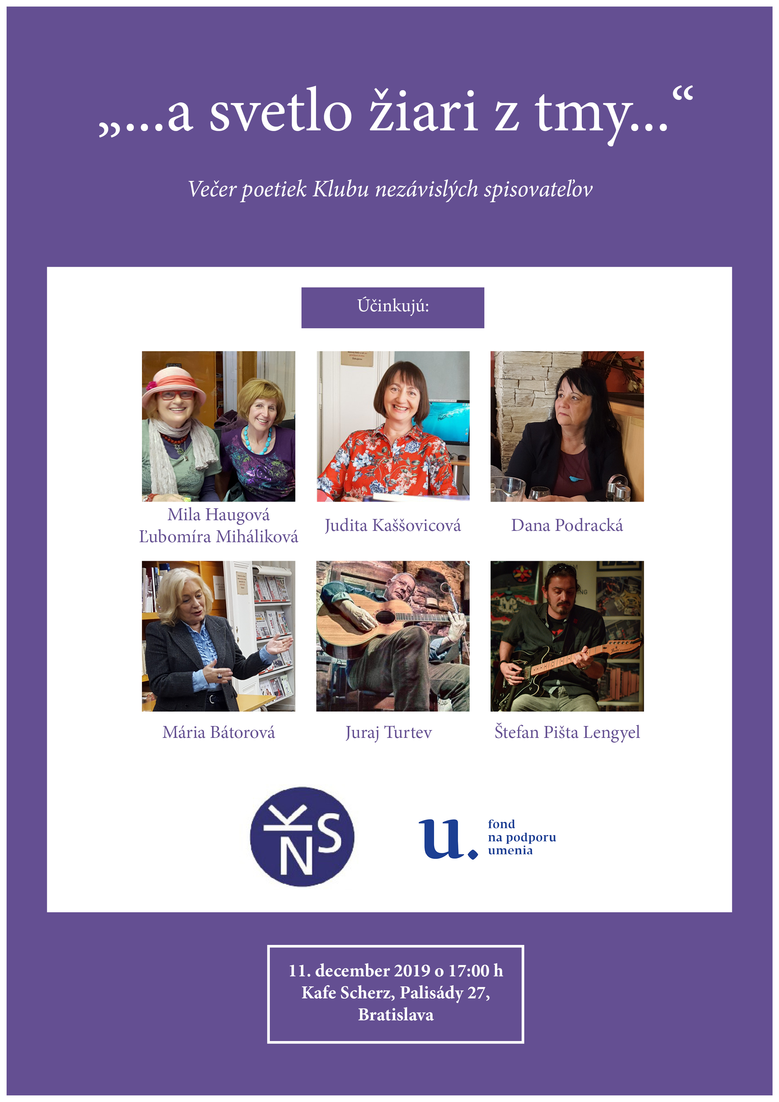"...a svetlo žiari z tmy..." VEČER POETIEK KLUBU NEZÁVISLÝCH SPISOVATEĽOV 11. december 2019 o 17.00 h v Kafe Scherz, Palisády 27, Bratislava Účinkujú: Mária Bátorová, Mila Haugová, Judita Kaššovicová, Ľubomíra Miháliková, Dana Podracká Večer uvádza Mila Haugová Hudobný sprievod: Juraj Turtev - gitara Štefan "Pišta" Lengyel - gitara