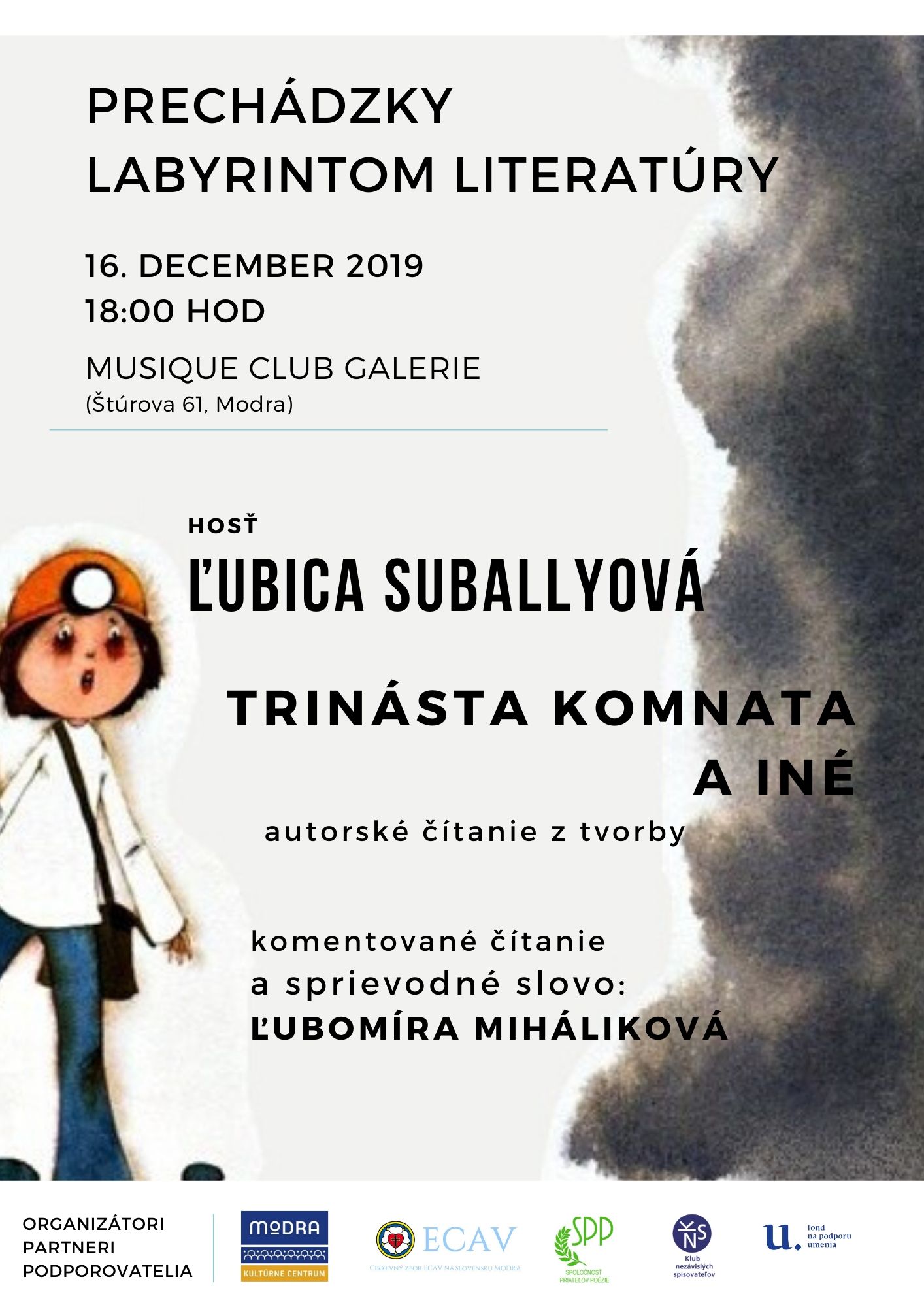 PRECHÁDZKY LABYRINTOM LITERATÚRY - Trinásta komnata a iné. Účinkujú Ľubica Suballyová a Ľubomíra Miháliková. Dátum a čas:16. december 2019 o 18.00 h Miesto: Musique Club Galerie, Štúrova 61, Modra