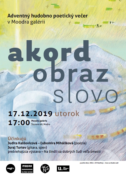 Adventný hudobno poetický večer v Moodra galérii: Akord Obraz Slovo Účinkujú: Judita Kaššovicová, Ľubomíra Miháliková a hudobník Juraj Turtev.