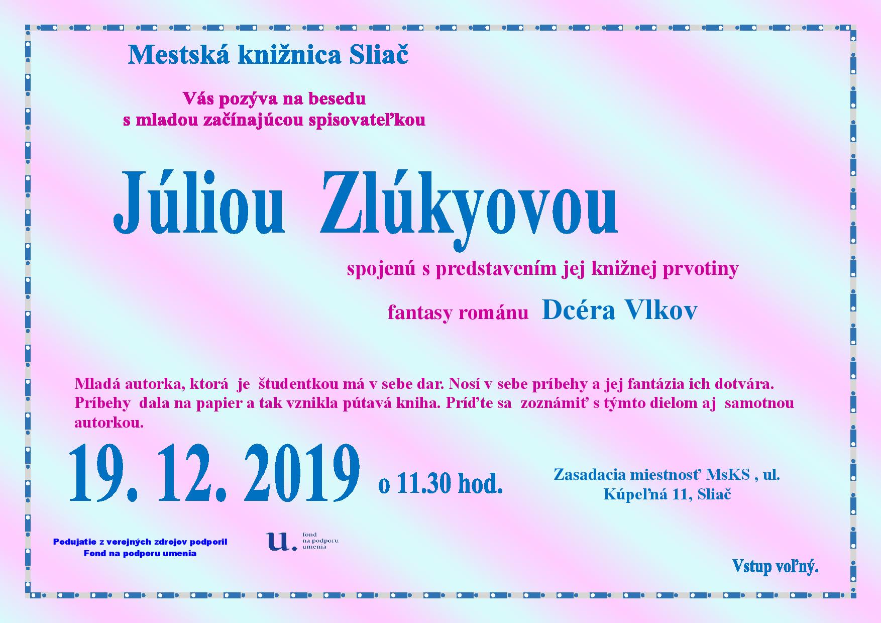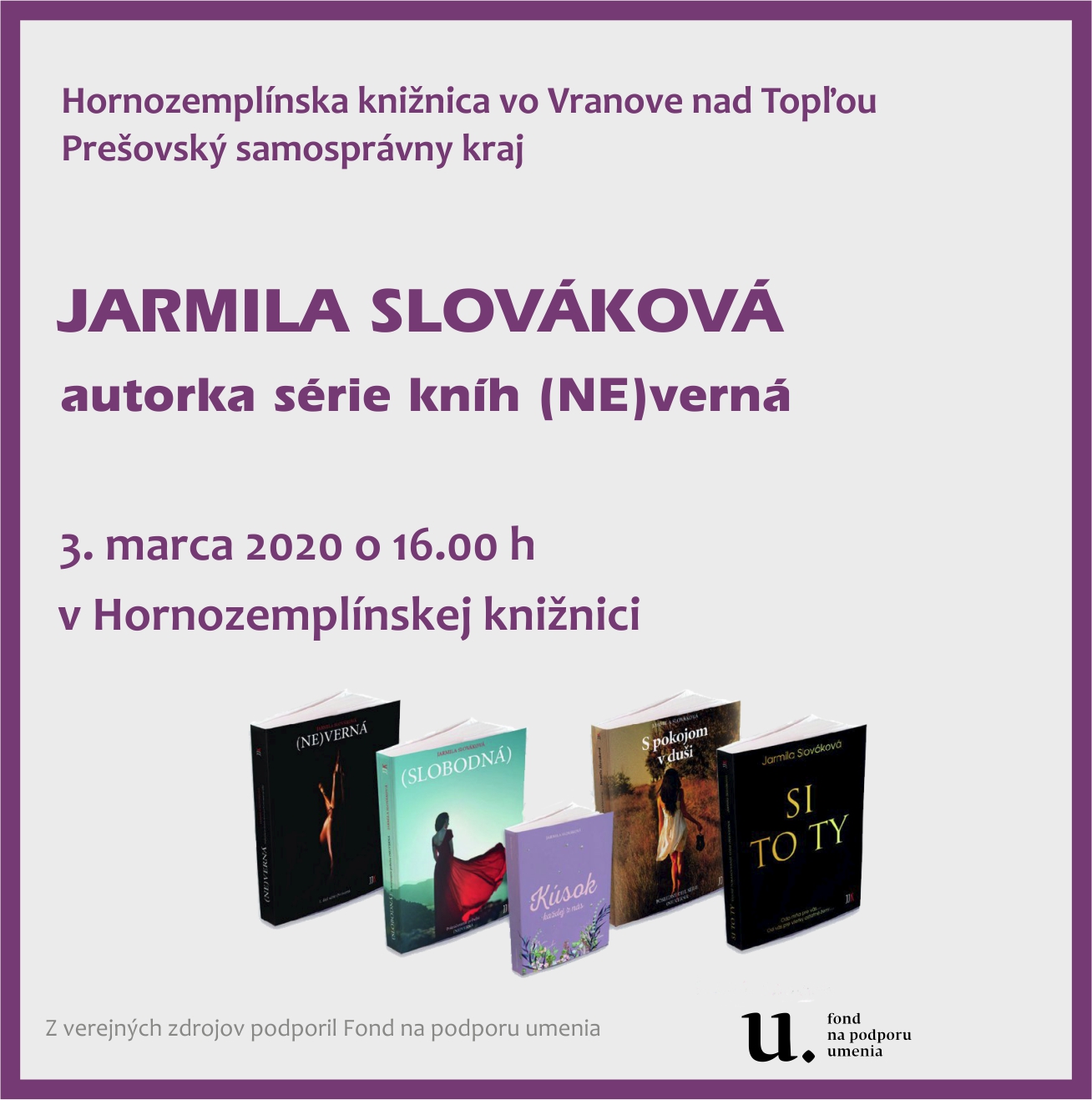 Hornozemplínska knižnica vo Vranove nad Topľou a Prešovský samosprávny kraj Vás pozývajú na besedu so spisovateľkou Jarmilou Slovákovou, ktorá sa uskutoční utorok 3. marca 2020 o 16.00 h v knižnici. Môžete sa tešiť na predstavenie série kníh Neverná, Slobodná a S pokojom v duši a ďalšie zaujímavé knihy. Tešíme sa na všetkých.