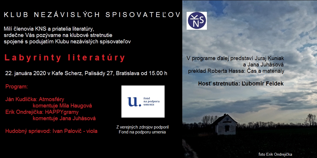 Labyrinty literatúry - komentované čítanie členov Klubu nezávislých spisovateľov v Kafe Scherz, Palisády 27, Bratislava od 15.00 hod. Účinkujú: Ján Kudlička, Mila Haugová, Erik Ondrejička, Jana Juhásová a ďalší...