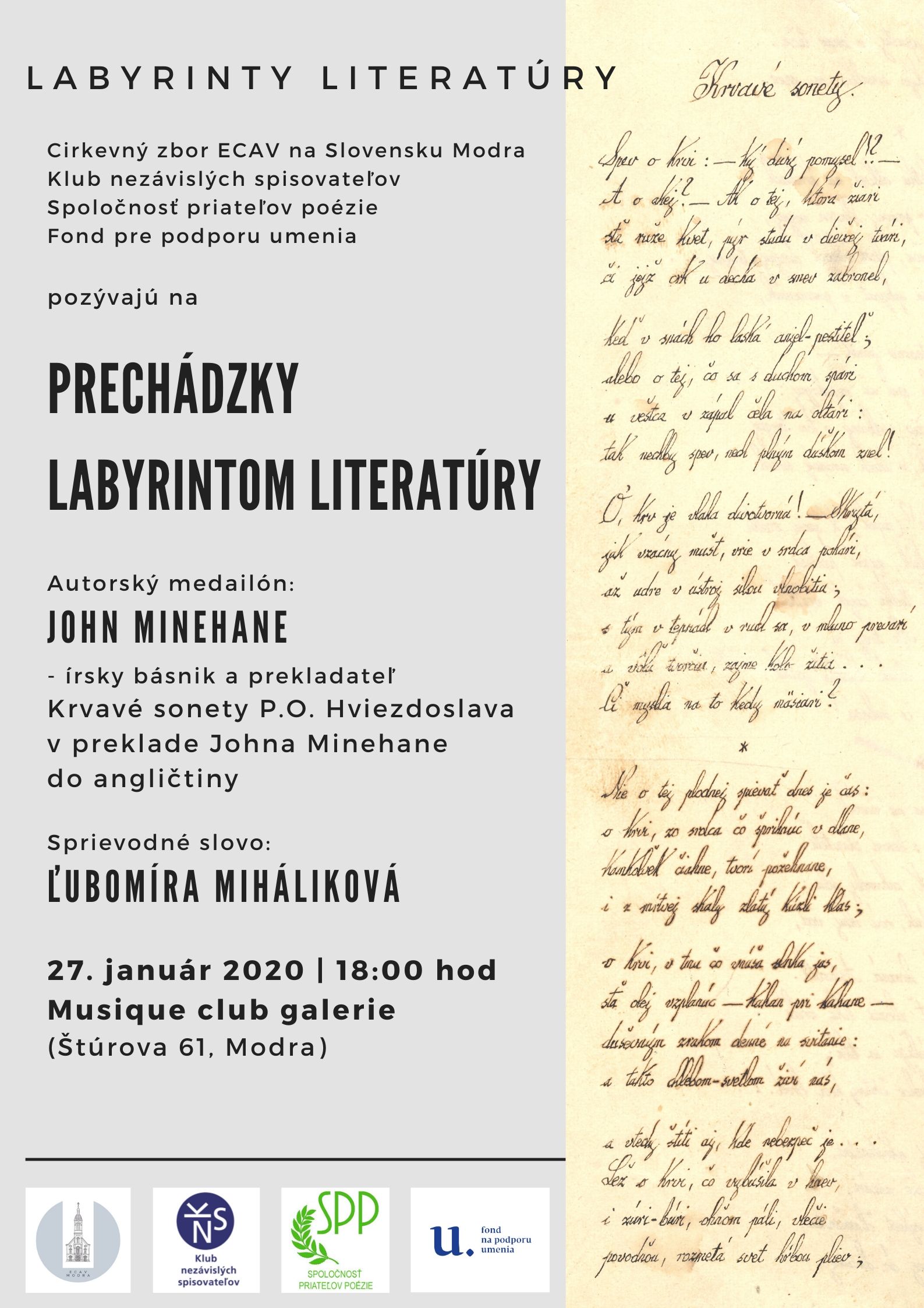 Labyrinty literatúry - Prechádzky labyrintom literatúry 27. 1. 2020 o 18:00 h v Musique club galerie, Štúrova 61, Modra. Autorský medailón írskeho básnika a prekladateľa Johna Minahana, člena Klubu nezávislých spisovateľov, prekladateľa Hviezdoslavových Krvavých sonetov do angličtiny. Autorské čítanie komentuje a večerom sprevádza Ľubomíra Miháliková.