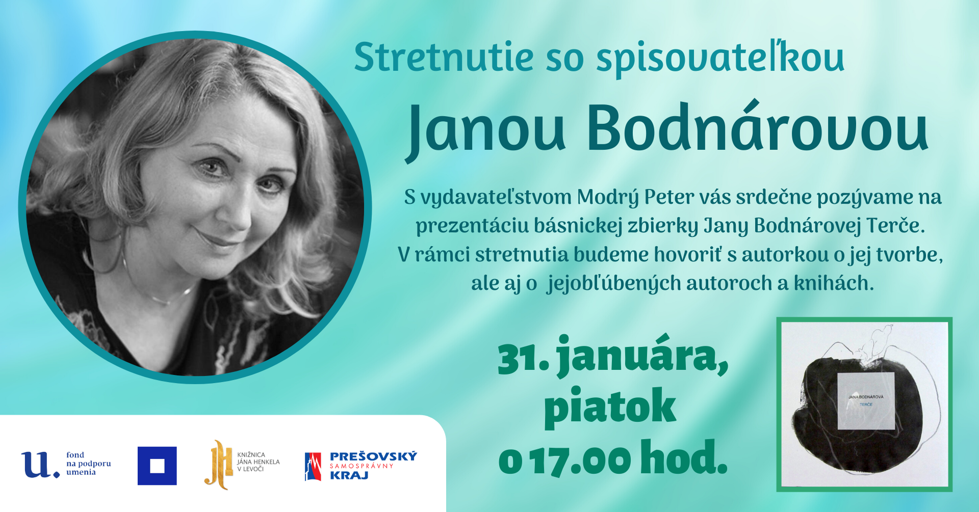 Uvedenie básnickej zbierky Jany Bodnárovej Terče (Modrý Peter, 2019) spojené s autorským čítaním z knihy a besedou s autorkou. Knižnica Jána Henkela v Levoči, 31. januára 2019 o 17.00 hodine. Uvádza editor Peter Milčák.