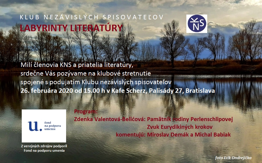 Labyrinty literatúry - komentované autorské čítanie členov Klubu nezávislých spisovateľov venované novej tvorbe Zdenky Valentovej-Belićovej. Komentujú Miroslav Demák a Michal Babiak. Podujatie sa uskutoční 26. februára 2020 od 15.00 h v Kafe Scherz, Palisády 27, Bratislava.