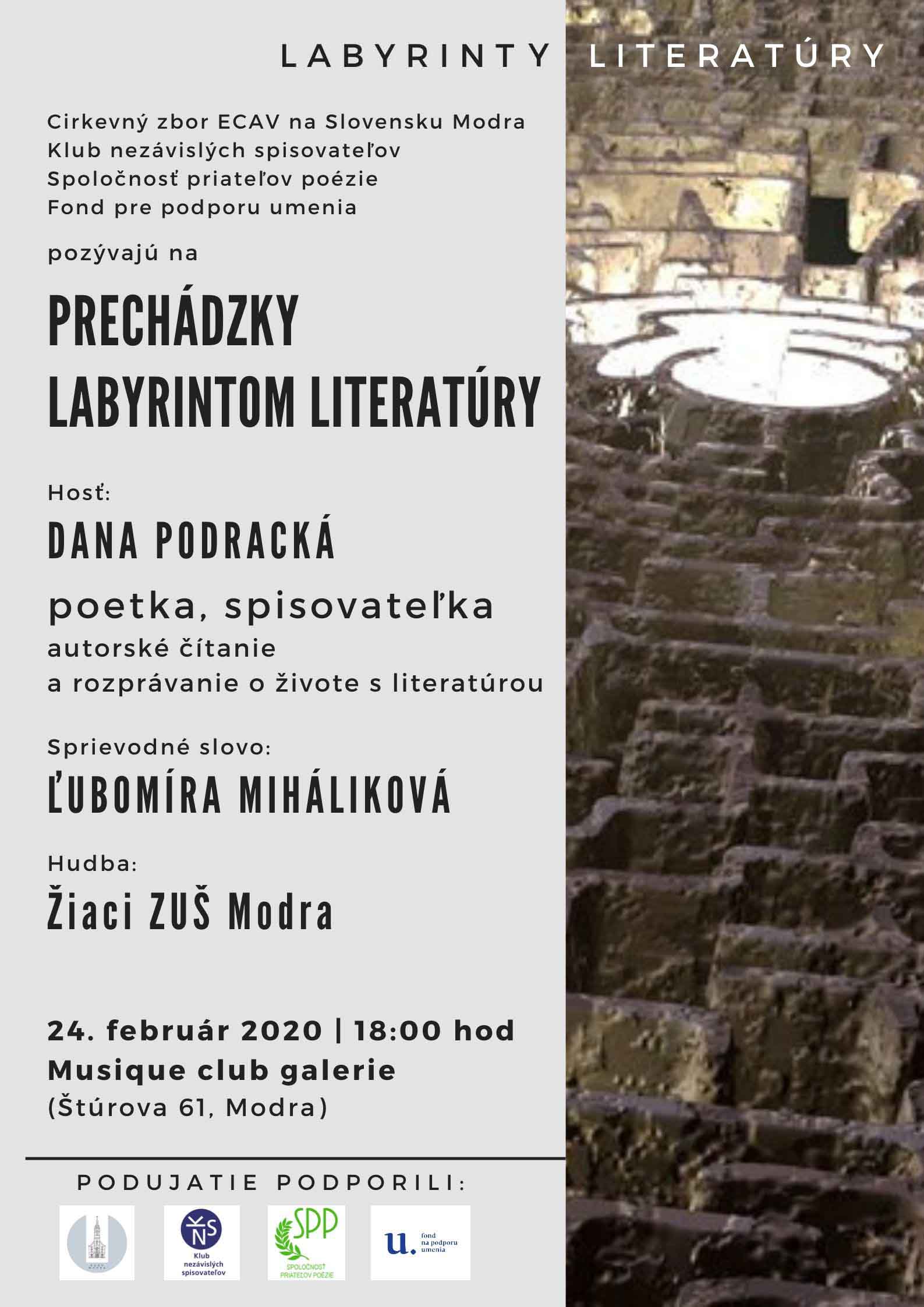 Podujatie projektu Labyrinty literatúry 24.2.2020 o 18.00 h v Musique club galerie, Štúrova 61, Modra V Prechádzkach Labyrintom literatúry bude hosťom poetka a spisovateľka Dana Podracká. Podujatie moderuje a tvorbu D. Podrackej komentuje Ľubomíra Miháliková.