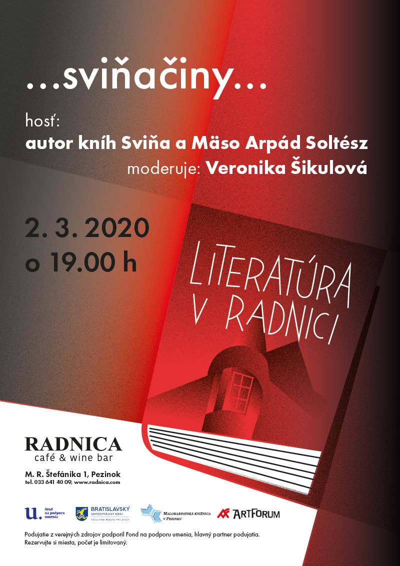 Beseda s novinárom a autorom kníh Sviňa a Mäso Arpádom Soltész v v príjemnom prostredí café a wine bar Radnica 2/3/2020 o 19.00 hod. Moderuje Verona Šikulová.