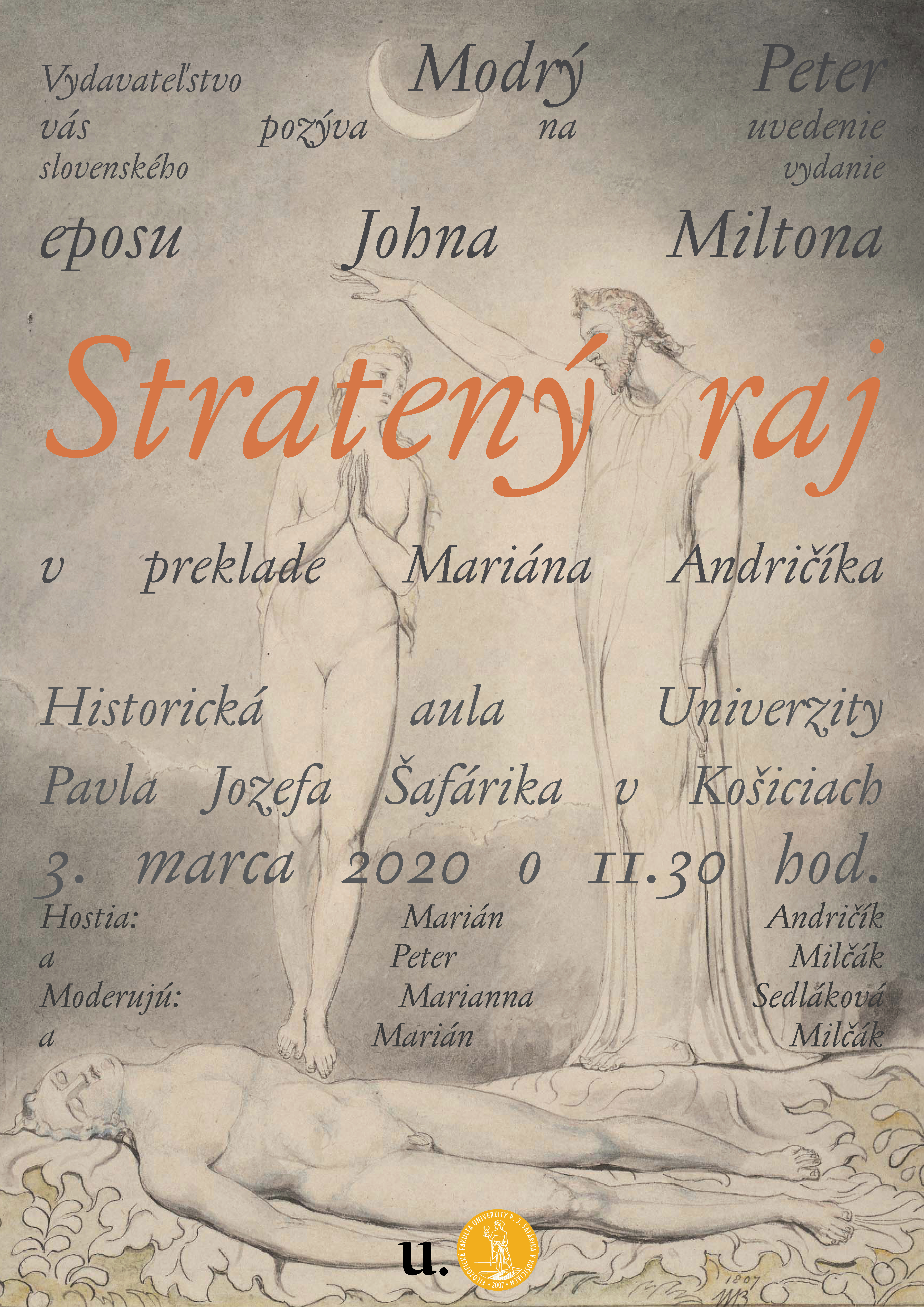 Vo vydavateľstve Modrý Peter vychádza historicky prvé slovenské vydanie Andričíkovho prekladu biblického eposu Stratený raj, ktorý spoluvytvára kánon svetovej literatúry. Je písaný blankversom – päťstopovým nerýmovaným jambickým veršom, ktorý je zachovaný aj v slovenskom znení. Viac ako šesťstostranová kniha v tvrdej väzbe s prebalom vychádza s pôvodnými ilustráciami Williama Blakea a v minimalistickej knižnej úprave Jakuba Milčáka.