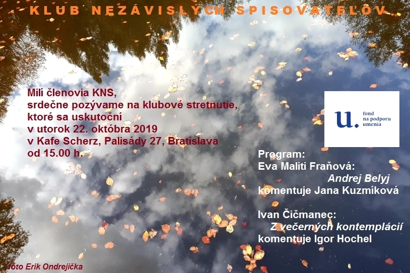 Komentované autorské čítanie autorov Klubu nezávislých spisovateľov 22. októbra 2019 od 15.00 v Kafe Scherz, Palisády 27, Bratislava Program: Eva Maliti Fraňová: Andrej Belyj, komentuje Jana Kuzmíková Ivan Čičmanec: Z večerných kontemplácií, komentuje Igor Hochel Podujatie je otvorené pre verejnosť.