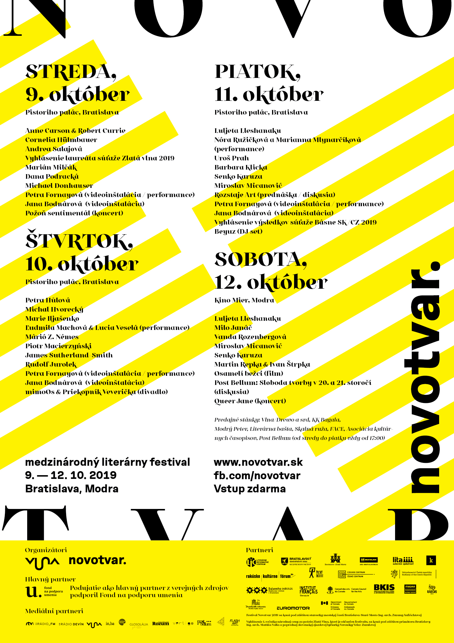 Novotvar 2019 prináša výber zaujímavých svetových aj domácich literárnych mien. Tri desiatky literárnych aj iných umelcov sa predstavia od 9. do 12. októbra v Pistoriho paláci v Bratislave a v Kine Mier v Modre.