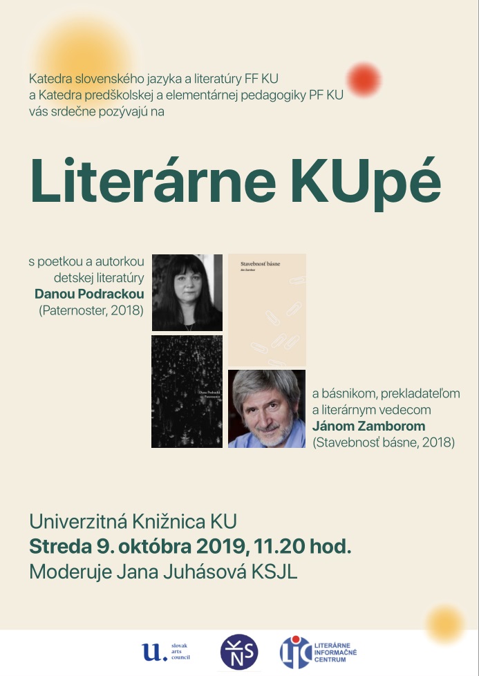 Podujatie v rámci projektu Komentované autorské čítanie "Literárne KUpé" s poetkou a autorkou detskej literatúry Danou Podrackou a básnikom, prekladateľom a literárnym vedcom Jánom Zamborom. Moderuje Jana Juhásová. 9. októbra 2019 o 11.20 v Univerzitnej knižnici KU Ružomberok