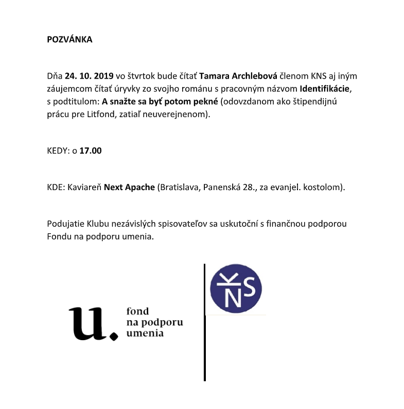 Dňa 24. 10. 2019 vo štvrtok bude čítať Tamara Archlebová členom KNS aj iným záujemcom čítať úryvky zo svojho románu s pracovným názvom Identifikácie, s podtitulom: A snažte sa byť potom pekné (odovzdanom ako štipendijnú prácu pre Litfond, zatiaľ neuverejnenom). KEDY: o 17.00 KDE: Kaviareň Next Apache (Bratislava, Panenská 28., za evanjel. kostolom). Podujatie Klubu nezávislých spisovateľov sa uskutoční s finančnou podporou Fondu na podporu umenia.