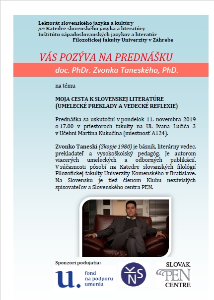 Moja cesta k slovenskej literatúre - prednáška Zvonka Taneskeho na Filozofickej fakulte Univerzity v Záhrebe 11. 11. 2019.