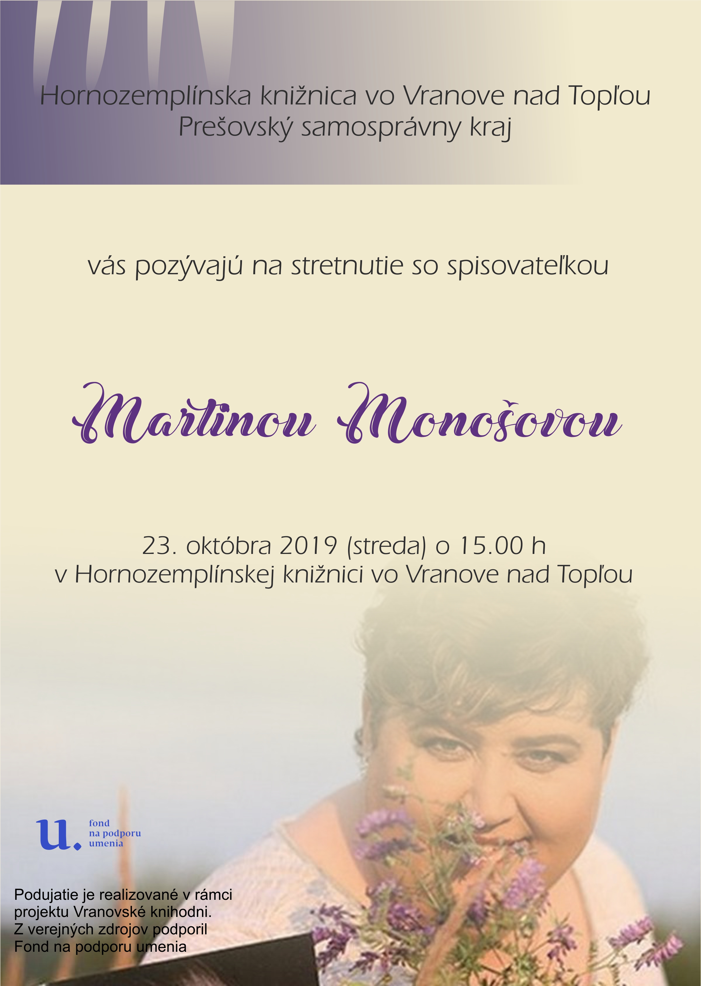 Hornozemplínska knižnica vo Vranove nad Topľou Vás pozýva na besedu so spisovateľkou Martinou Monošovou, ktorá sa uskutoční 23. októbra 2019 (streda) o 15.00 hod. Podujatie sa realizuje v rámci projektu Vranovské knihodni, ktorý z verejných zdrojov podporil Fond na podporu umenia.