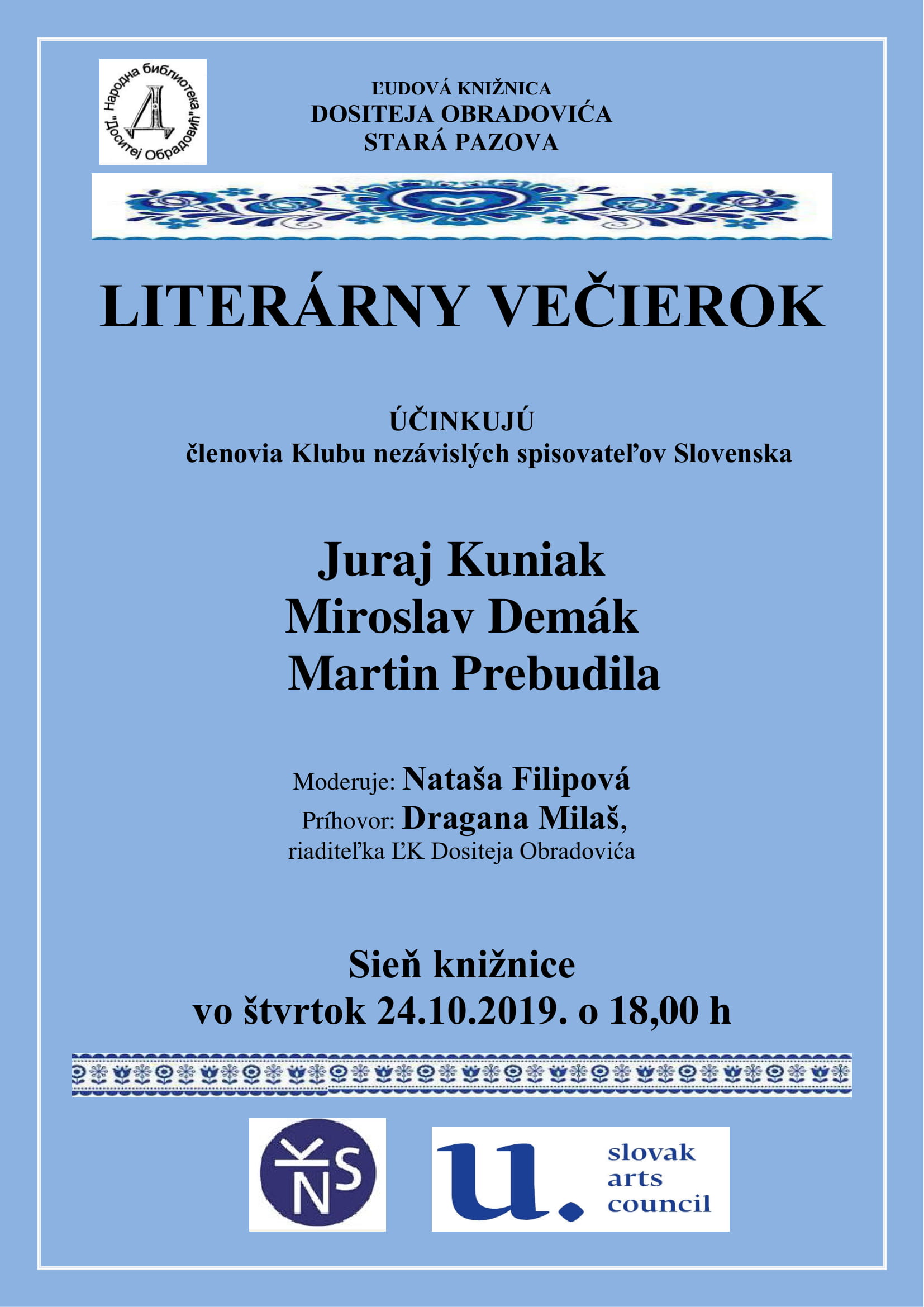 Literárny večierok členov Klubu nezávislých spisovateľov Juraja Kuniaka, Miroslava Demáka a Martina Prebudilu v Ľudovej knižnici Dositeja Obradoviča v Starej Pazove, Srbsko. Podujatie sa uskutoční 24. 10. 2019 o 18.00 h.