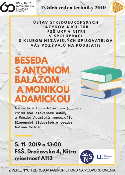 Beseda s Antonom Balážom a Monikou Adamickou. Anton Baláž predstaví svoju novú knihu Dva slovenské osudy a Monika Adamická monografiu Slovenské židovstvo v tvorbe Antona Baláža.