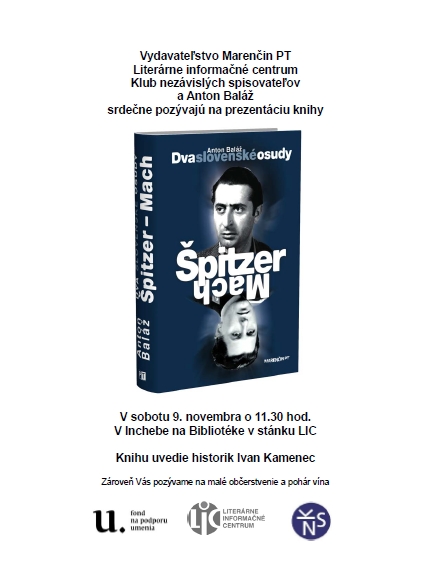 Prezentácia knihy Antona Baláža: Dva slovenské osudy /Špitzer - Mach/. V prítomnosti autora knihu uvedie Ivan Kamenec. Bibliotéka, 9. novembra 2019 o 11,30 v stánku LIC.