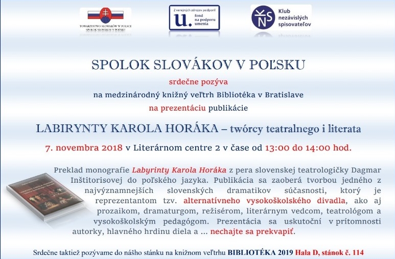 Prezentácia publikácie - prekladu monografie Labyrinty Karola Horáka z pera slovenskej teatrologičky Dagmar Inštitorisovej. V spolupráci s Klubom nezávislých spisovateľov organizuje Spolok Slovákov v Poľsku. Prezentácia sa uskutoční za prítomnosti Karola Horáka.
