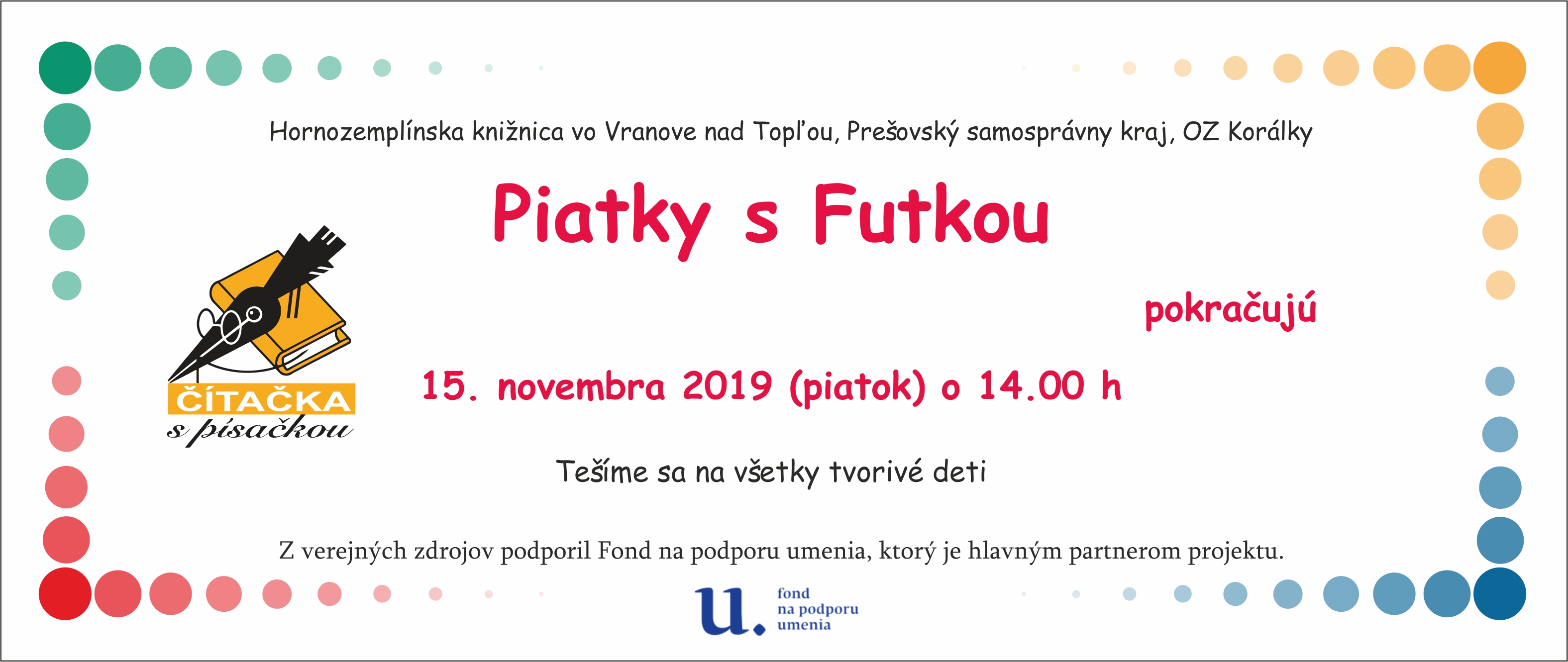 Hornozemplínska knižnica vo Vranove nad Topľou aj v novom školskom roku pokračuje s realizáciou literárno-tvorivých stretnutí s obľúbenou spisovateľkou pre deti a mládež Gabrielou Futovou. Cieľom stretnutí je podporiť u detí tvorivosť, kreativitu a záujem o literatúru a čítanie. Najbližšie stretnutie sa uskutoční 15.11.2019 o 14.00 hod.