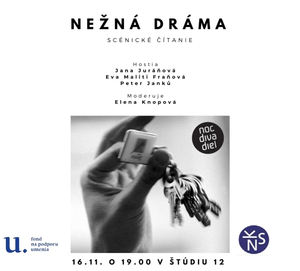 Nežná dráma - scénické čítanie Hostia: Jana Juráňová, Eva Maliti Fraňová, Peter Janků Moderuje Elena Knopová 16. 11. 2019 o 19.00 v Štúdiu 12, Jakubovo námestie 12, Bratislava