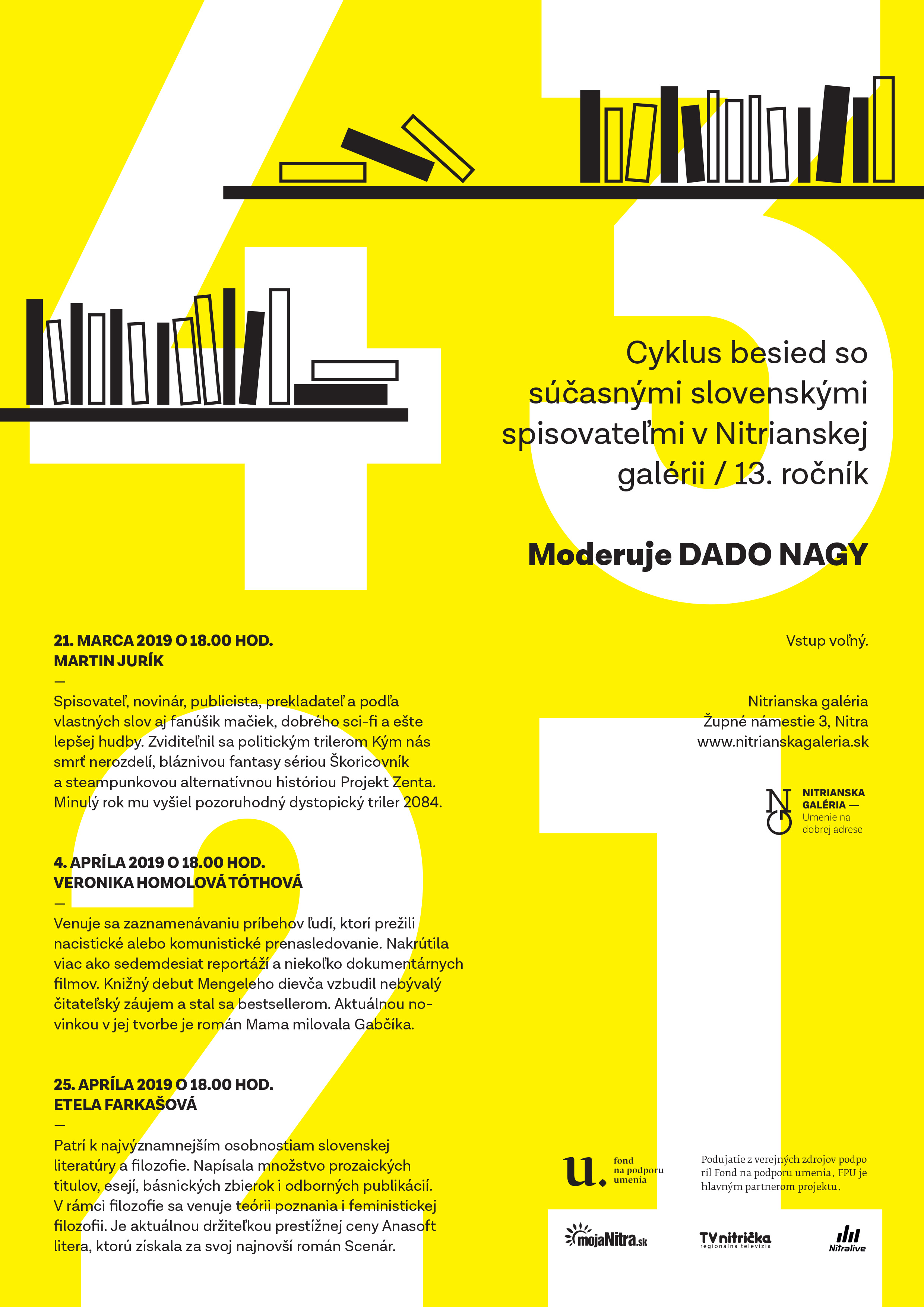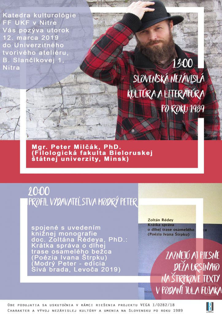 Podujatie organizuje vydavateľstvo Modrý Peter v spolupráci s Katedrou kulturológie UKF v Nitre a uskutoční sa v Univerzitnom tvorivom ateliéri, B. Slančíkovej 1 v Nitre o 18.00 hodine. Účinkujú: Peter Milčák, Zoltán Rédey, Júlis Fujak Uvedenie monografie Zoltána Rédeya v prítomnosti autora, a ďalších vydavateľských noviniek z roku 2018 (Dorota Koman Stroj na čítanie, Marcin Świetlicki Nesamozrejmé, Jon Fosse Básne, Dušan Dušek Veľká potreba lampášov).