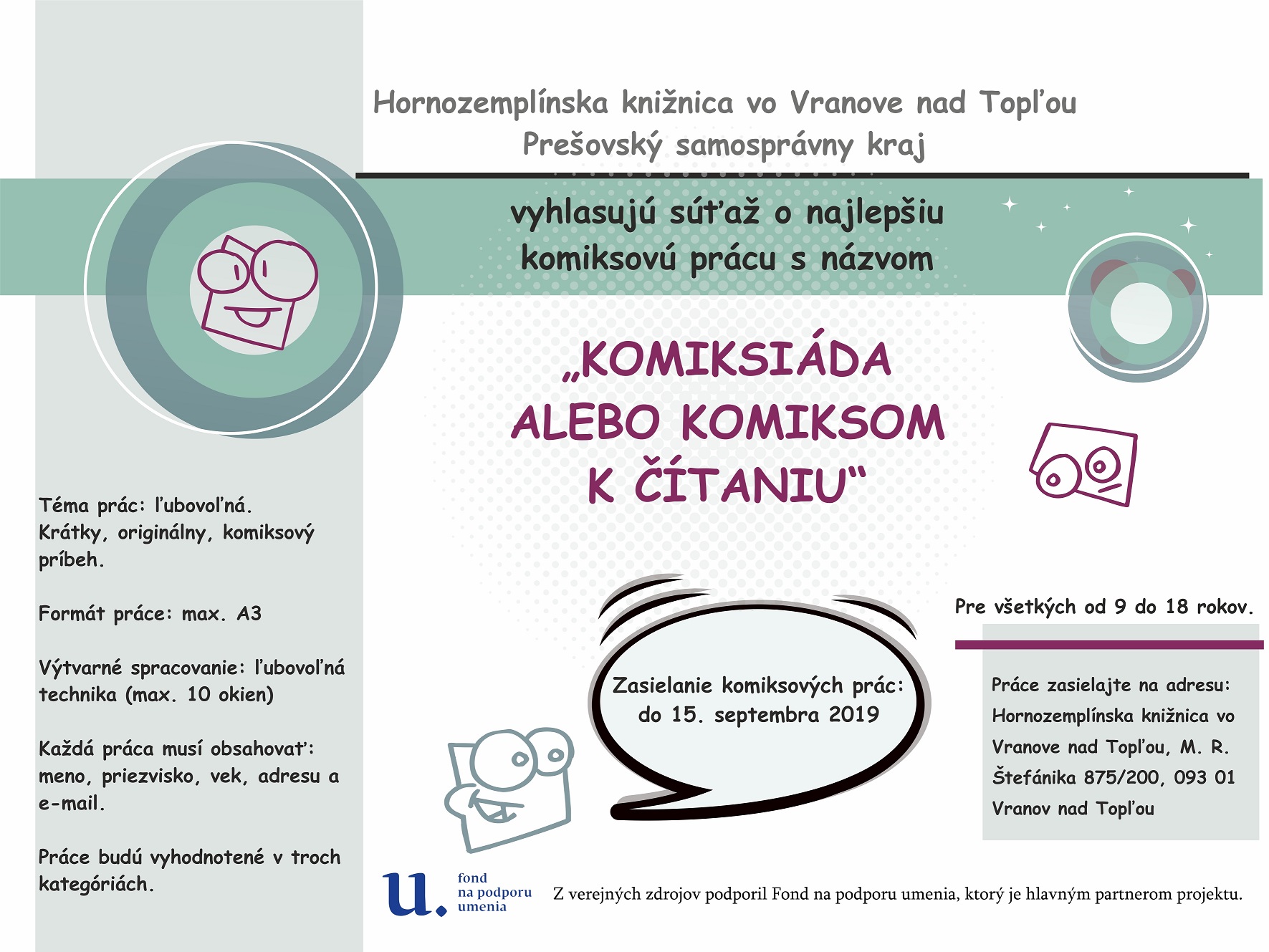 „KOMIKSIÁDA ALEBO KOMIKSOM K ČÍTANIU“. Súťaž je určená všetkým od 9 do 18 rokov a témou je vytvoriť krátky, originálny, komiksový príbeh.