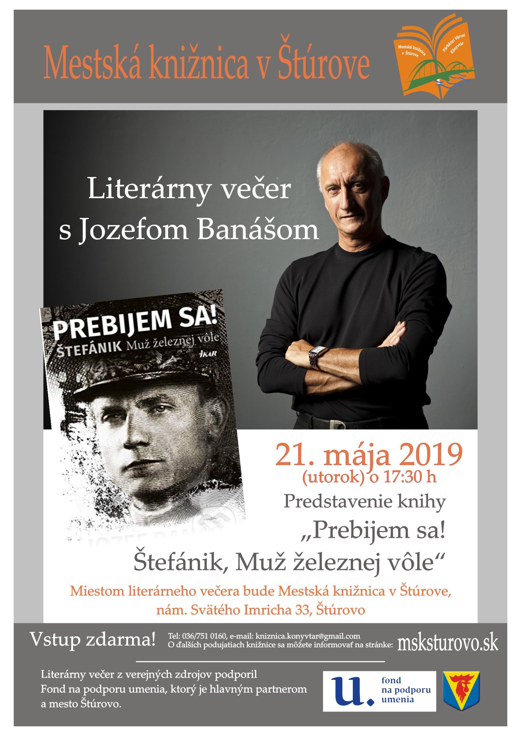 Literárny večer s Jozefom Banášom, predstavenie knihy „Prebijem sa! Štefánik, Muž železnej vôle“ dňa 21. mája 2019 (utorok) o 17:30 h. Miestom literárneho večera bude Mestská knižnica v Štúrove, nám. Svätého Imricha 33, Štúrovo. Tel.: 036/751 0160, e-mail: kniznica.konyvtar@gmail.com Vstup zdarma. O ďalších podujatiach knižnice sa môžete informovať na stránke: msksturovo.sk. Literárny večer z verejných zdrojov podporil Fond na podporu umenia, ktorý je hlavným partnerom a mesto Štúrovo.
