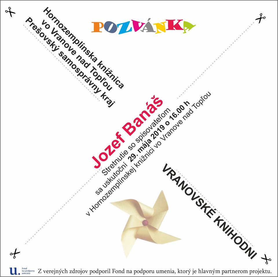 Hornozemplínska knižnica vo Vranove nad Topľou a Prešovský samosprávny kraj vás pozývajú na stretnutie so spisovateľom, diplomatom a topmanažérom Jozefom Banášom, ktoré bude v stredu 29. mája 2019 o 16.00 h v Hornozemplínskej knižnici.