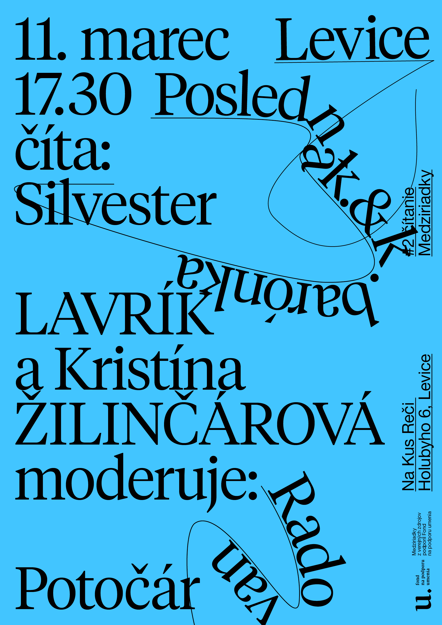 Po februárovej čítačke K. Kucbelovej a K. Janačkovej v Prahe sa autorské čítania Medziriadkov v marci vracajú na Slovensku. Pozvanie do Levíc prijali Silvester Lavrík a Kristína Žilinčárová. Ako to už na našich čítačkách chodí, priestor opäť dostáva jeden známy etablovaný autor a jedna mladá začínajúca autorka, finalistka Medziriadkov.