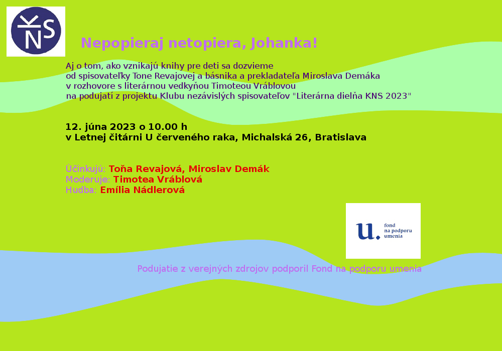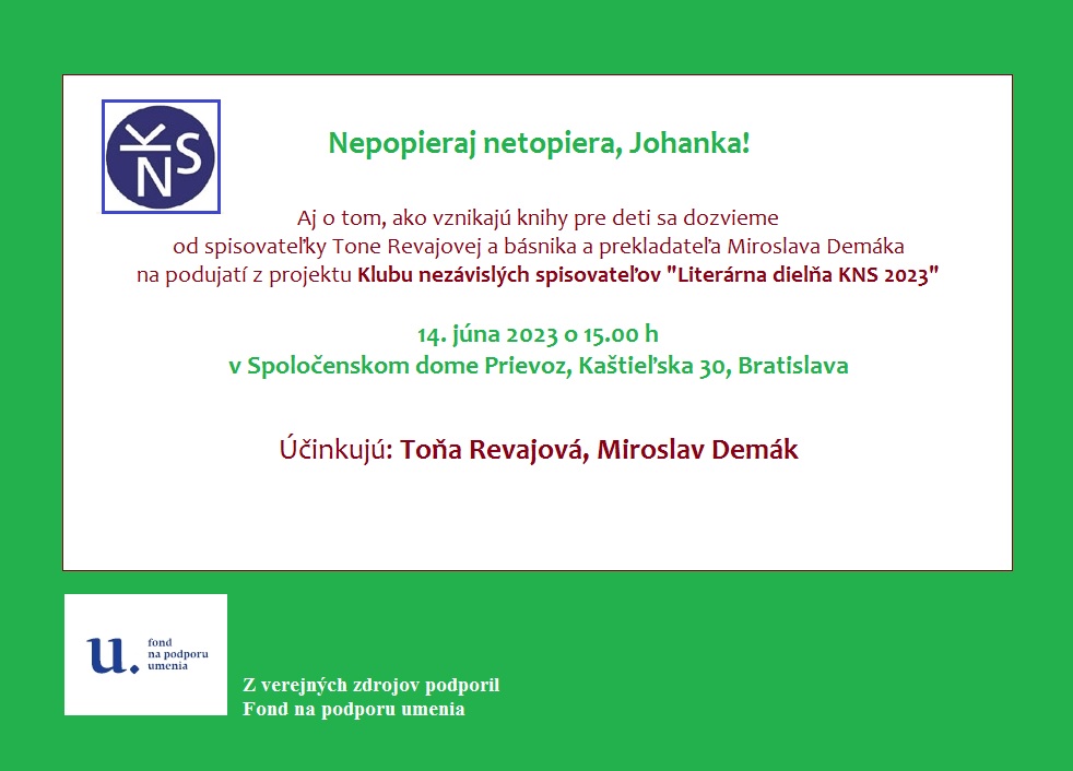 Projekt Literárna dielňa KNS 2023 prináša podujatia, ktoré sa venujú najmä aktuálnej pôvodnej domácej literárnej tvorbe. Reflektuje tvorbu autorov v pestrom rozsahu - od pripravovaných diel až po retrospektívu ich tvorby, ale najmä najnovšie vydané knižné tituly. Aj o tom, ako vznikajú knihy pre deti sa dozvieme od spisovateľky Tone Revajovej a básnika a prekladateľa Miroslava Demáka v rozhovore s literárnou vedkyňou Timoteou Vráblovou v podujatí "Nepopieraj netopiera, Johanka!"
