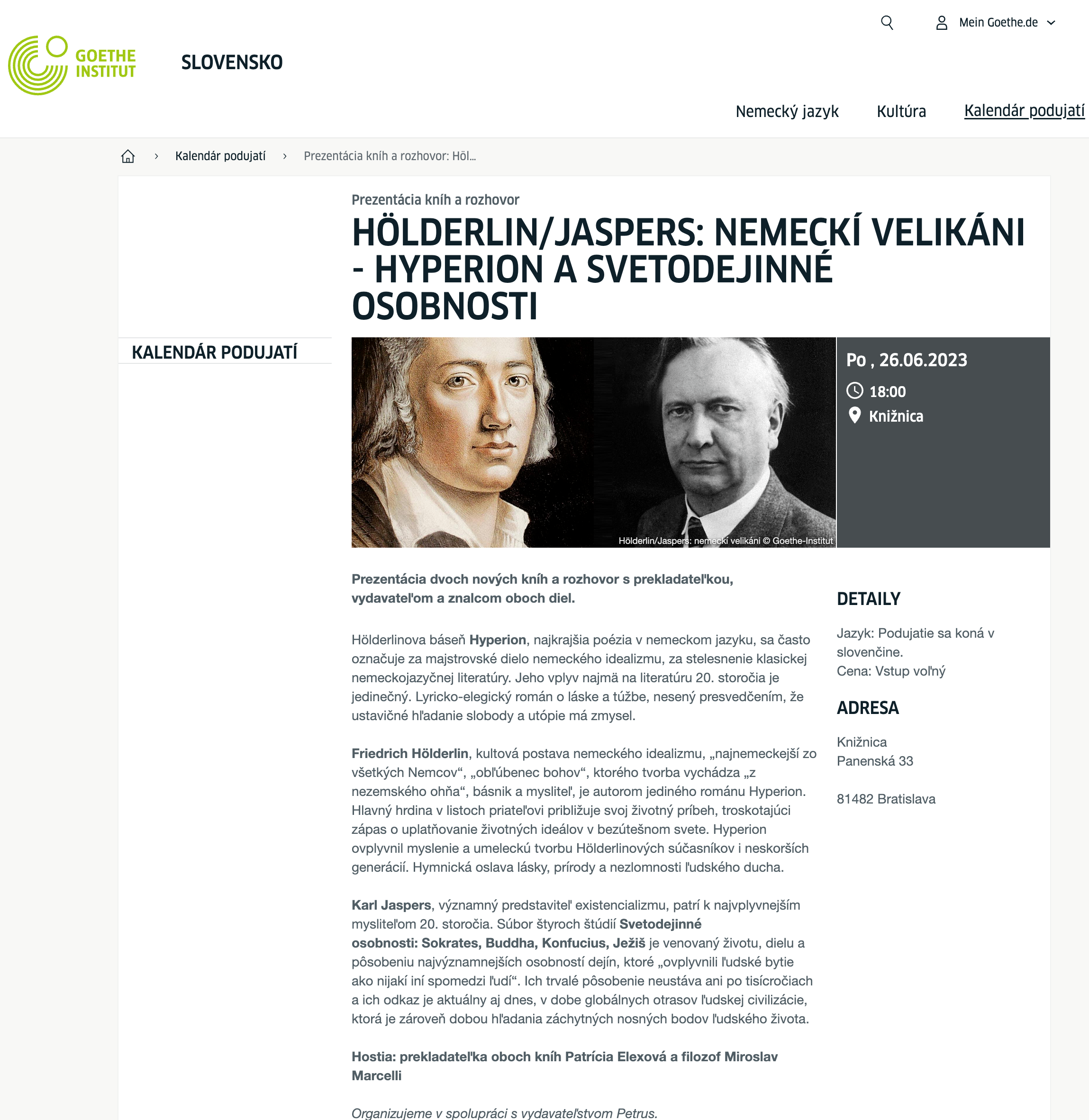 Slovenské vydanie Hölderlinovho románu Hyperion vyšlo vo vydavateľstve Petrus v roku 2023. ISBN: 978-80-89913-92-3 Rozsah: 196 strán