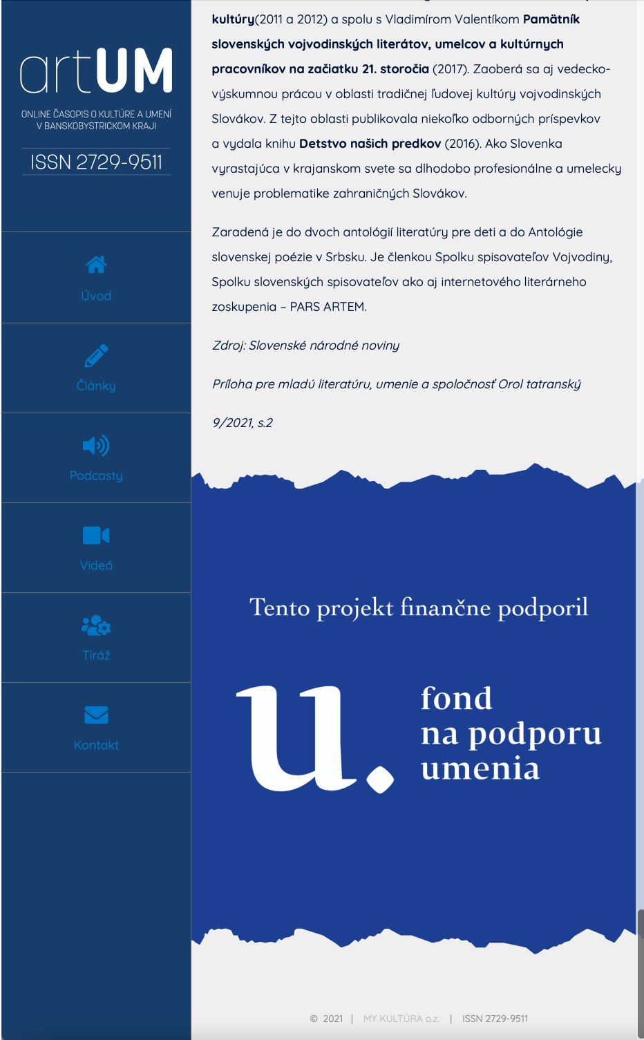 Fond na podporu umenia nenesie žiadnu zodpovednosť za úplnosť, správnosť a pravdivosť, ako ani za legalitu údajov uvedených v tejto časti webového portálu FPU. Všetky zverejnené informácie, v textovej, hypertextovej alebo obrazovej forme sú výlučnou zodpovednosťou prijímateľa finančných prostriedkov poskytnutých Fondom na podporu umenia, ktorý preberá zodpovednosť za zverejnené informácie súhlasom s podmienkami FPU a samotným zverejnením informácií na webovom portáli FPU.