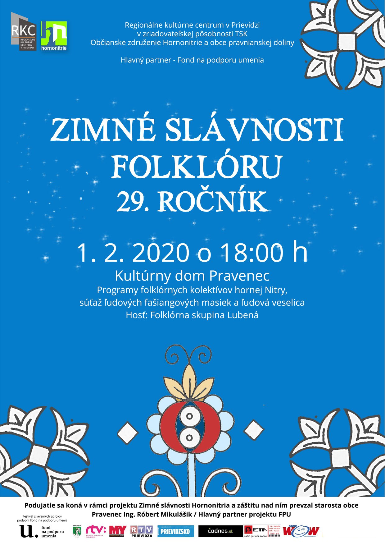 Regionálne kultúrne centrum v Prievidzi v zriaďovateľskej pôsobnosti Trenčianskeho samosprávneho kraja, občianske združenie Hornonitrie, obce pravnianskej doliny a hlavný partner Fond na podporu umenia Vás pozývajú na 29. Zimné slávnosti folklóru.
