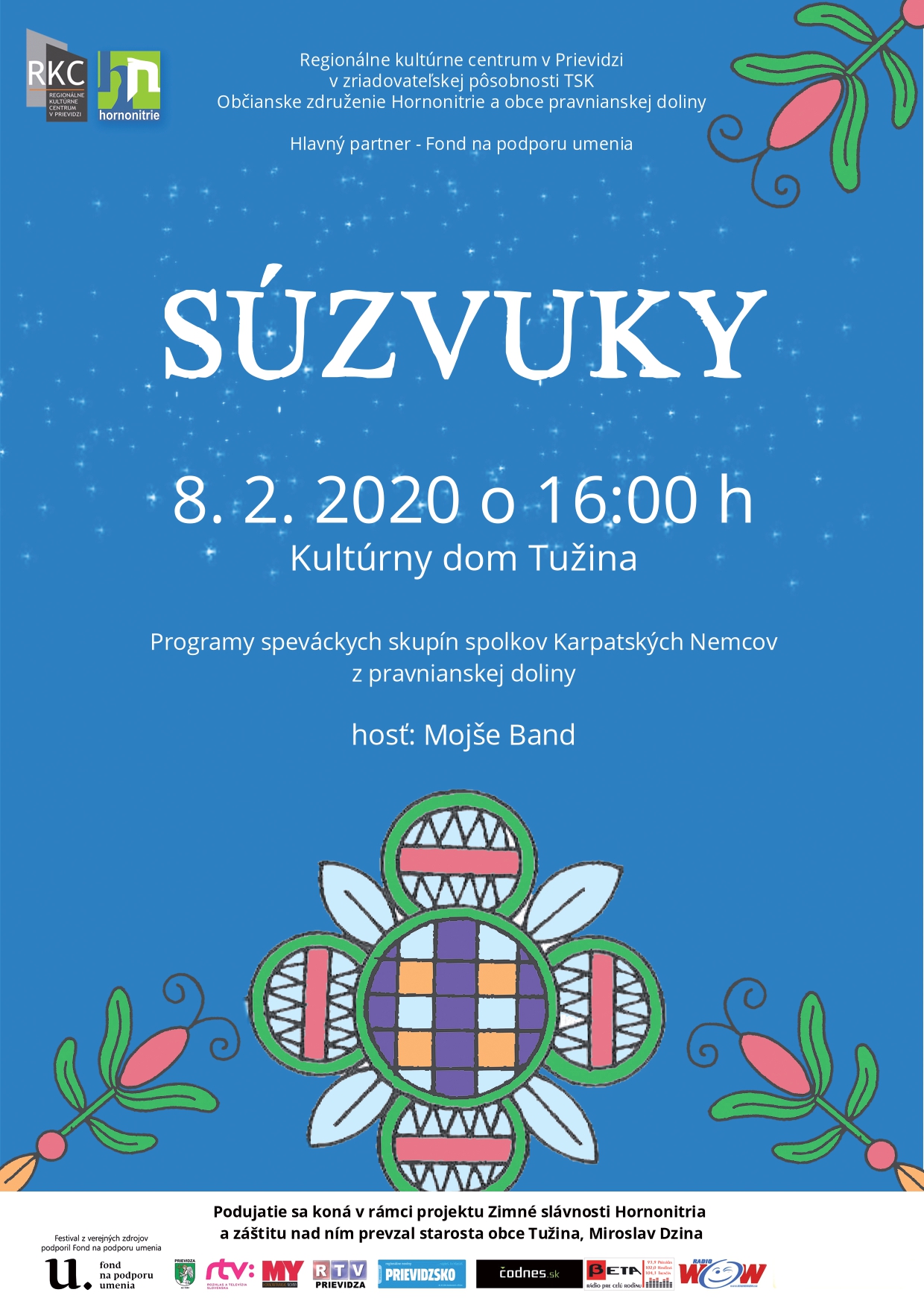 Regionálne kultúrne centrum v Prievidzi v zriaďovateľskej pôsobnosti Trenčianskeho samosprávneho kraja, Občianske združenie Hornonitrie, obce pravnianskej doliny a hlavný partner podujatia Fond na podporu umenia Vás pozývajú na podujatie Súzvuky, ktoré je súčasťou 17. Zimných slávností Hornonitria.