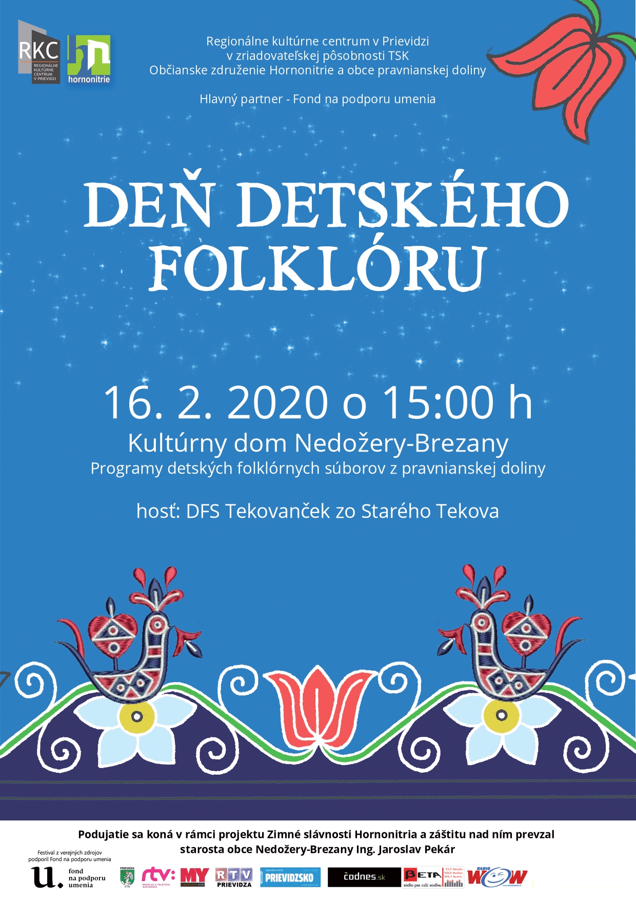 Regionálne kultúrne centrum v Prievidzi v zriaďovateľskej pôsobnosti Trenčianskeho samosprávneho kraja, občianske združenie Hornonitrie, obce pravnianskej doliny a hlavný partner Fond na podporu umenia Vás pozývajú na Deň detského folklóru, ktorý sa uskutoční v rámci 17. ZIMNÝCH SLÁVNOSTÍ HORNONITRIA.