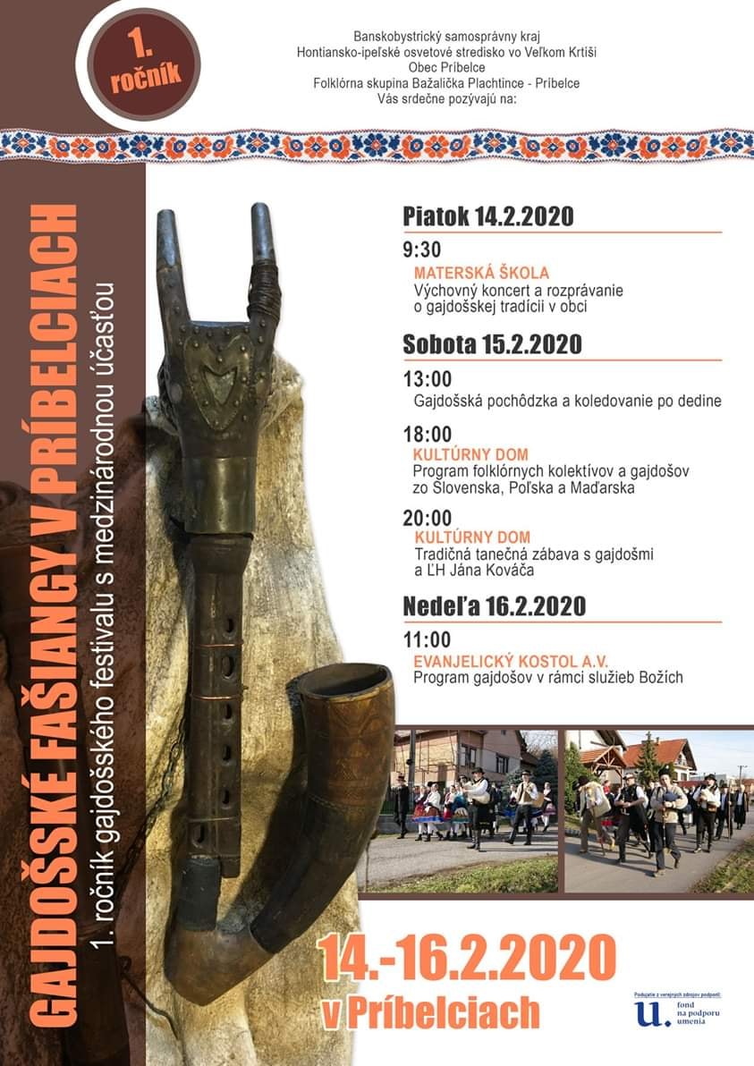 Gajdošské fašiangy v Príbelciach, 1. ročník gajdošského festivalu s medzinárodnou účasťou, prezentácia gajdošskej kultúry v obci Príbelce formou výstavy (fotografie z výskumu a text,postupy výroby, hudobné nástroje) v priestoroch obecného úradu obce Príbelce v spolupráci s Hontiansko-ipeľským osvetovým strediskom vo Veľkom Krtíši. Výchovný koncert pre deti v Materskej škole v Príbelciach, folklorne vystúpenia v ramci festivalu (hra na gajdy, gajdošské piesne a tance).