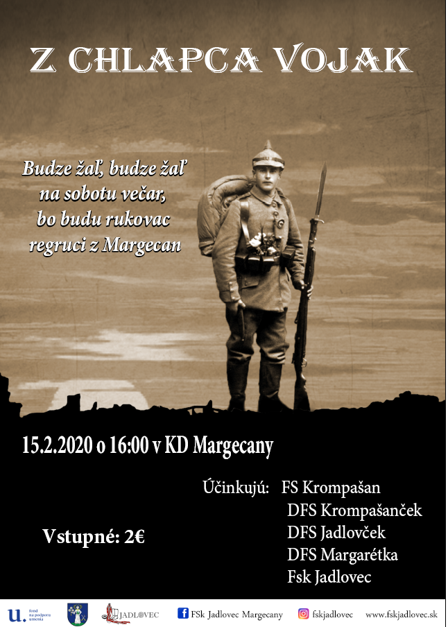 V rámci projektu sme zrealizovali a nacvičili tanečno-speváckeho pásma pod názvom Z chlapca vojak. Prezentovanie pásma sme naplánovali na v Margecanoch na podujatí ,,Fašengi so sušedami", ktoré organizujeme spoločne s obcou. V pásme sme spracovali regrútsku rozlúčka, margecianske tance,detské hry na vojakov a pod. V rámci projektu sme zabezpečili kroje pre folklórnu skupinu Jadlovec a detský folklórny súbor Margarétka.