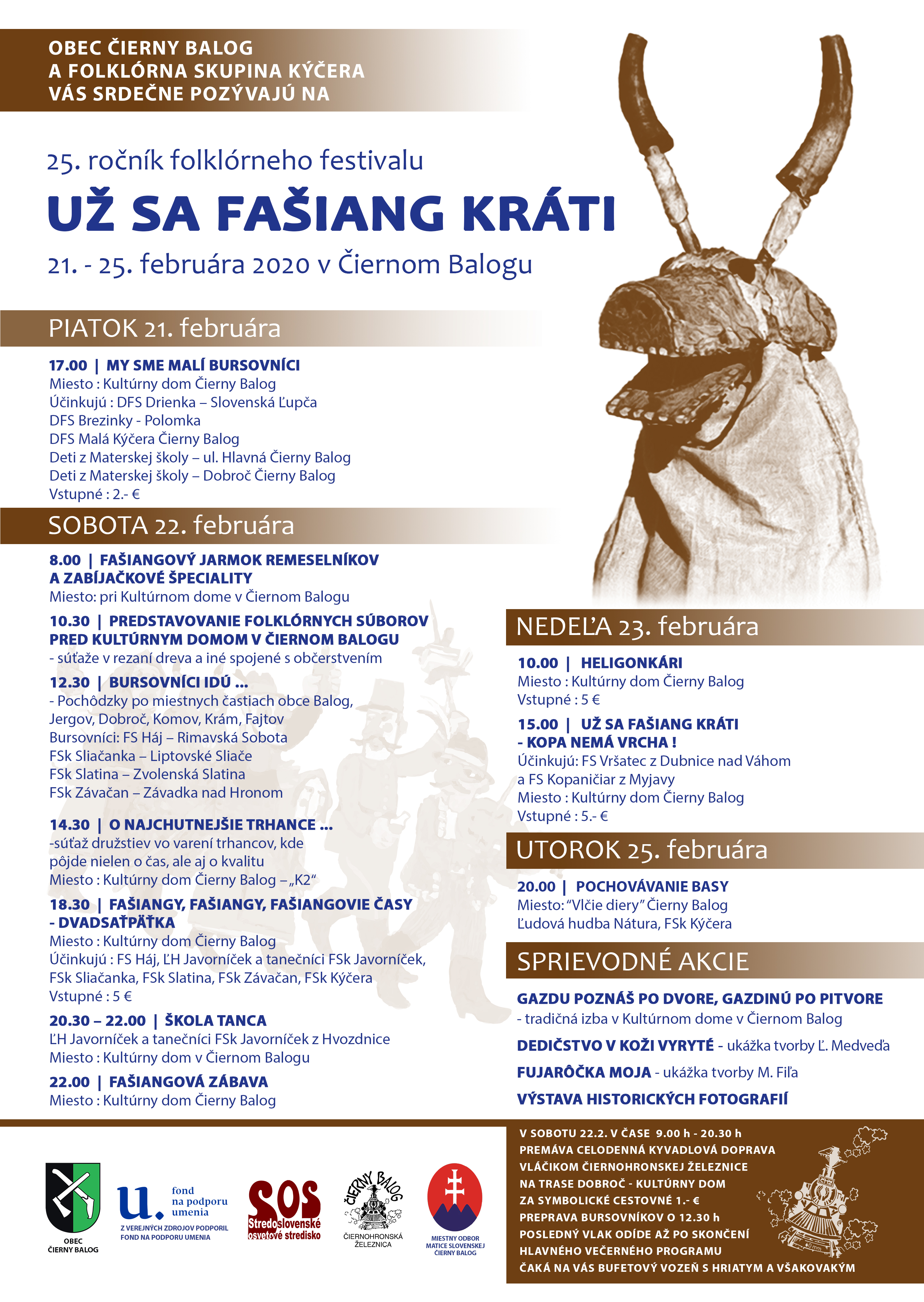 Záverečný program z cyklu "Osobnosti terchovskej muziky", tentokrát s fašiangovou tematikou. Ľudová pieseň a hudba sprevádzala našich predkov od kolísky po hrob v rámci rodinných zvykov, ale aj od Fašiangov do Vianoc v rámci kalendárnych zvykov. Práve v predpôstnom období Fašiangov mala sláčiková muzika z kraja Jánošíka svoju dôležitú úlohu pri pochôdzkach obcou a rôznych ľudových zábavách so spevom a tancom.