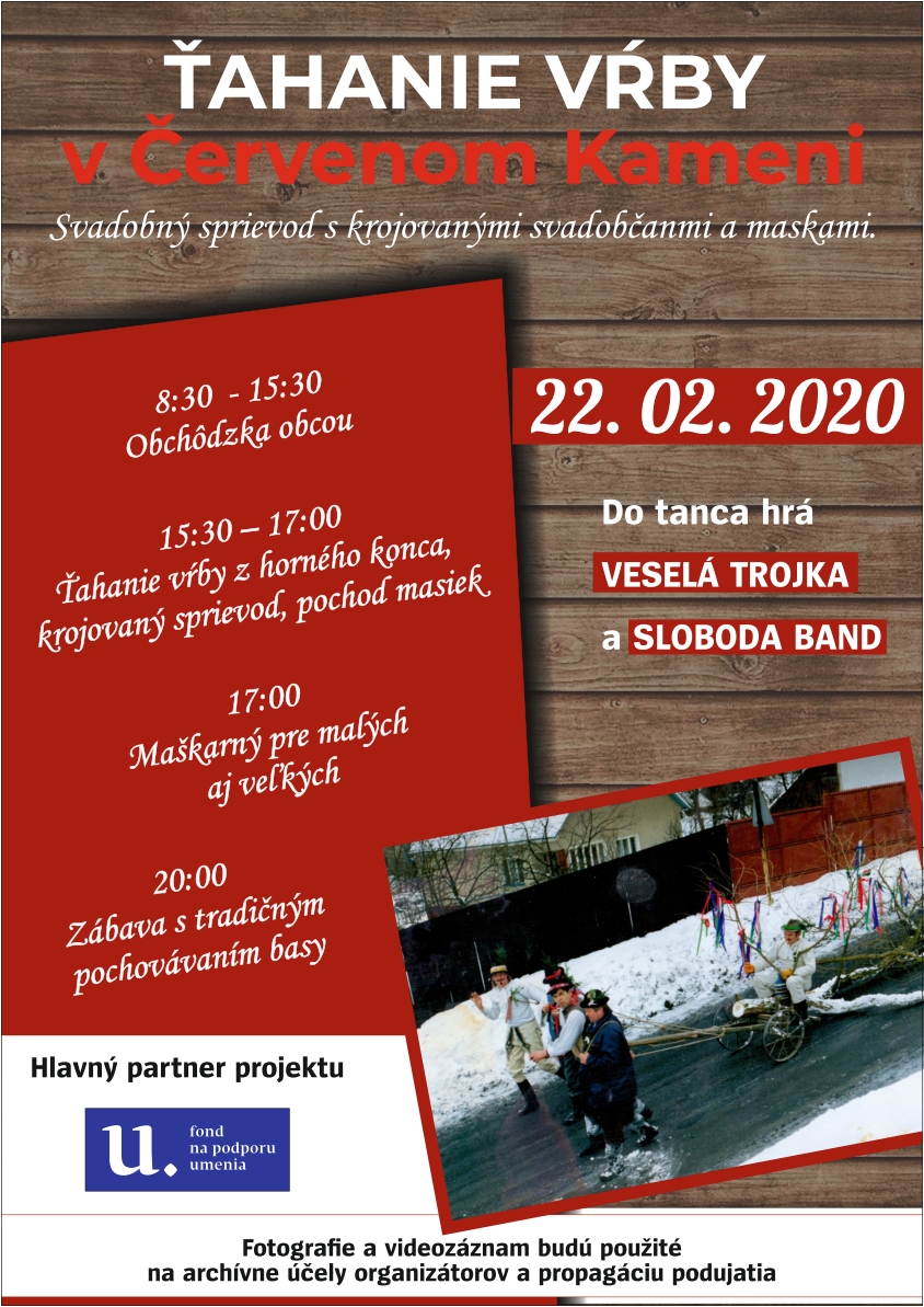 ŤAHANIE VŔBY Svadobný sprievod s krojovanými svadobčanmi a maskami sa uskutoční v sobotu 22. februára 2020 v Červenom Kameni. Sprievod pôjde z horného konca obce, od zastávky Hámra do kultúrneho domu.