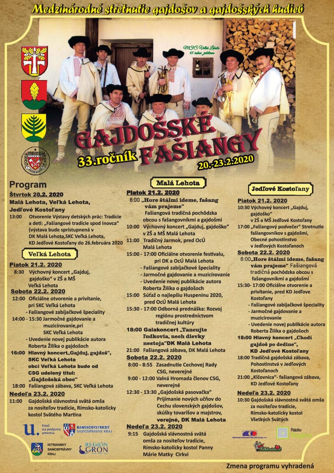 Festival Gajdošské fašiangy v troch obciach Malá Lehota, Veľká Lehota a Jedľové Kostoľany je ojedinelým tradičným podujatím svojho druhu. Oblasť Pohronského Inovca už po 33-tí krát privíta gajdošov z rôznych kútov Slovenska i zahraničia aby spolu v tradičnom duchu oslávili a miestnym obyvateľom zaželali fašang veselý či tichý. Príďte si vychutnať tradičnú gajdošskú fašiangovú oslavu. Podujatie je vhodné pre všetky vekové kategórie.