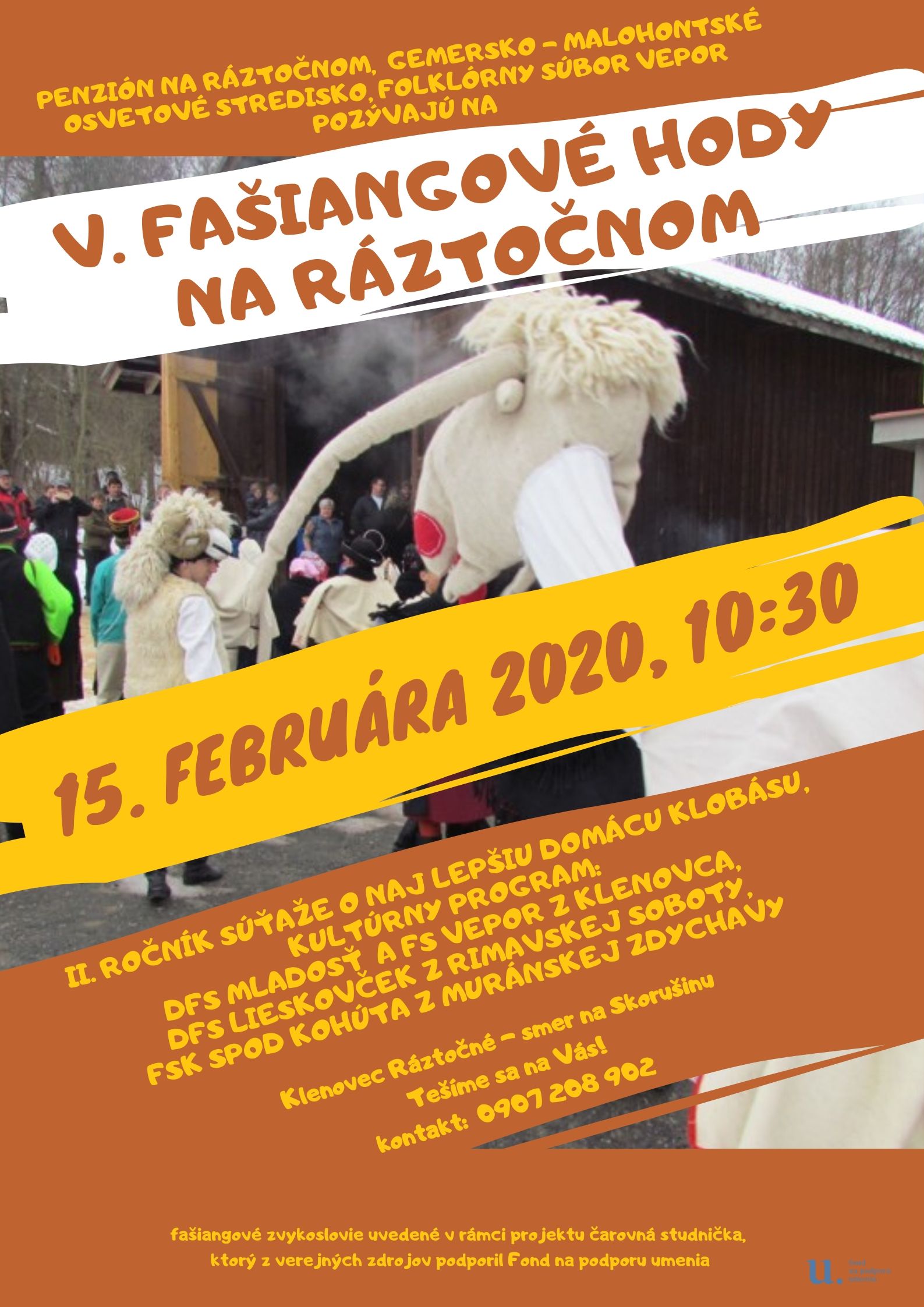 Fašiangové hody - fašiangové zvykoslovie v rámci projektu Čarovná studnička, uvedú FS Vepor a DFS Mladosť z Klenovca, DFS Lieskovček z Rimavskej Soboty Folklórna skupina Spod Kohúta z Muránskej Zdychavy, 15. februára 2020, od 10:30, v Penzióne na Ráztočnom v Klenovci. Aktivity projektu z verejných zdrojov podporil Fond na podporu umenia.