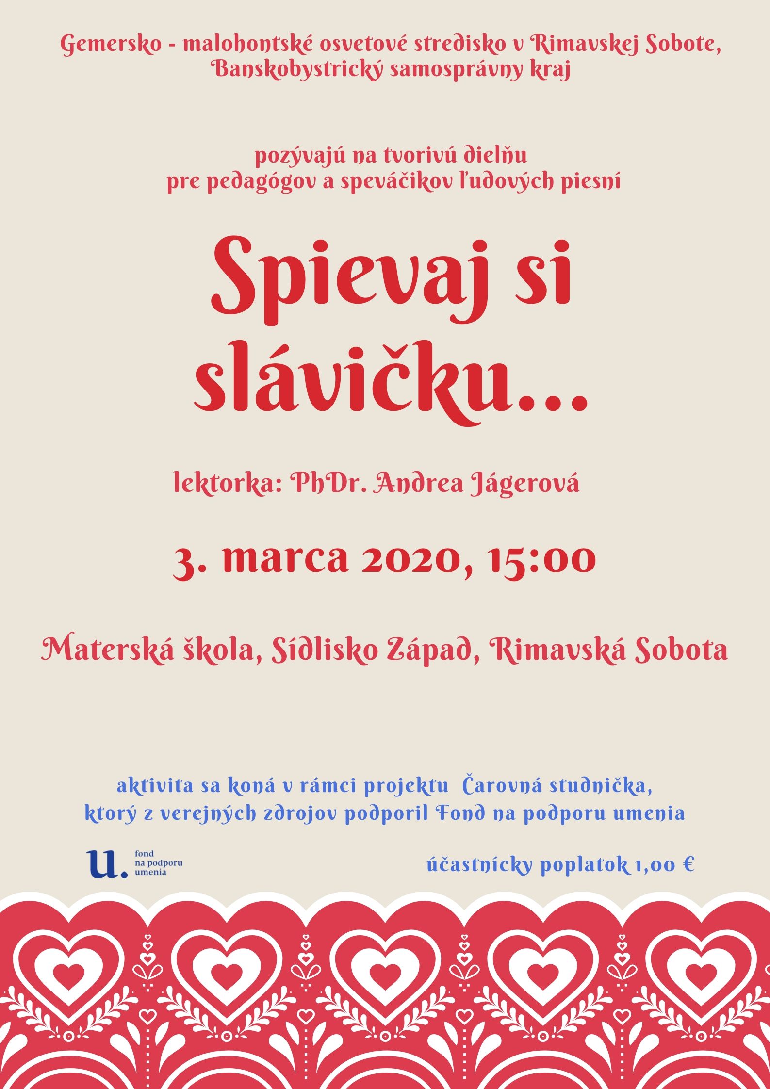 Spievaj si slávičku...., školenie pre pedagógov a spevákov ľudových piesní s lektorkou Andreou Jágerovou, v rámci projektu Čarovná studnička, ktorý z verejných zdrojov podporil Fond na podporu umenia.