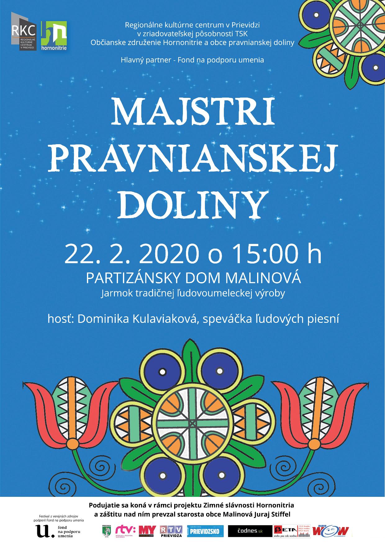Regionálne kultúrne centrum v Prievidzi v zriaďovateľskej pôsobnosti Trenčianskeho samosprávneho kraja, občianske združenie Hornonitrie, obce pravnianskej doliny a hlavný partner Fond na podporu umenia Vás pozývajú na 17. ZIMNÉ SLÁVNOSTI HORNONITRIA, v rámci ktorých sa uskutoční podujatie Deň majstrov pravnianskej doliny.