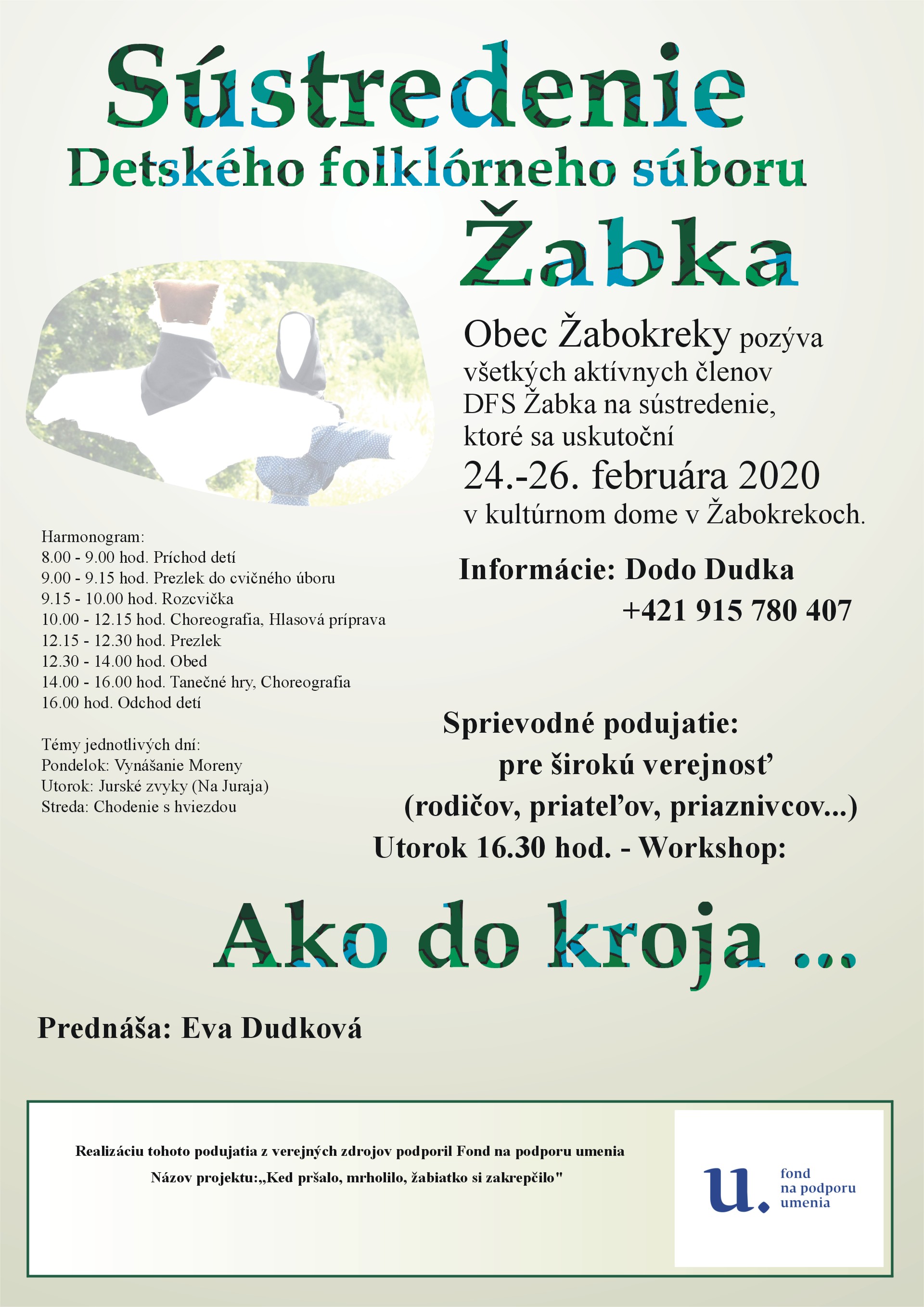 Sústredenie členov Detského folklórneho súboru Žabka v dňoch 24.-26.februára 2020 v sále Kultúrneho domu Žabokreky bude veľkým prínosom pre rozvoj dobrého vzťahu detí ku tradičnej ľudovej kultúre .Deti sa už tešia na tanečné hry a spoločne strávené dni pri nácviku choreografií.