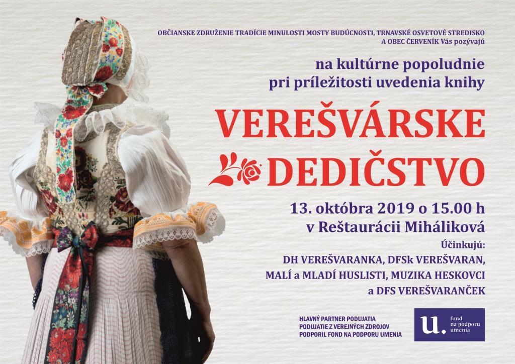 Predstavenie publikácie Verešvárske dedičstvo verejnosti určené všetkým obyvateľom Červeníka, širokého okolia a priaznivcom tradičného ľudového umenia spojené s kultúrnym programom, v ktorom sa predstavia červenícke folklórne telesá. Na podujatí bude možnosť zakúpiť si publikáciu Verešvárske dedičstvo.