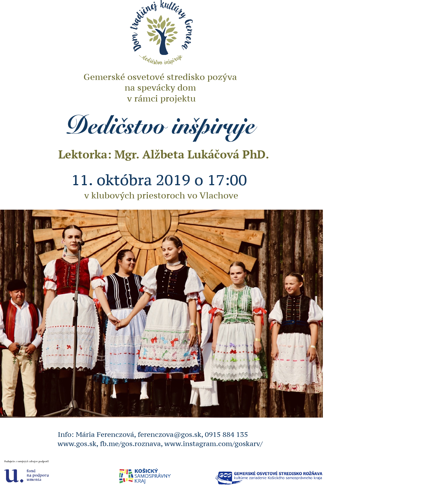 Folklórny súbor Prameň Dolná Strehová vystúpi v piatok, 18.10. 2019 o 17:00 hod. v rámci Dňa úcty k starším v Dolnej Strehovej s novou tanečnou, hudobnou a speváckou choreografiou, ktorú nacvičil v rámci projektu Sústredenie FS Prameň Dolná Strehová vďaka finančnej podpore Fondu na podporu umenia.